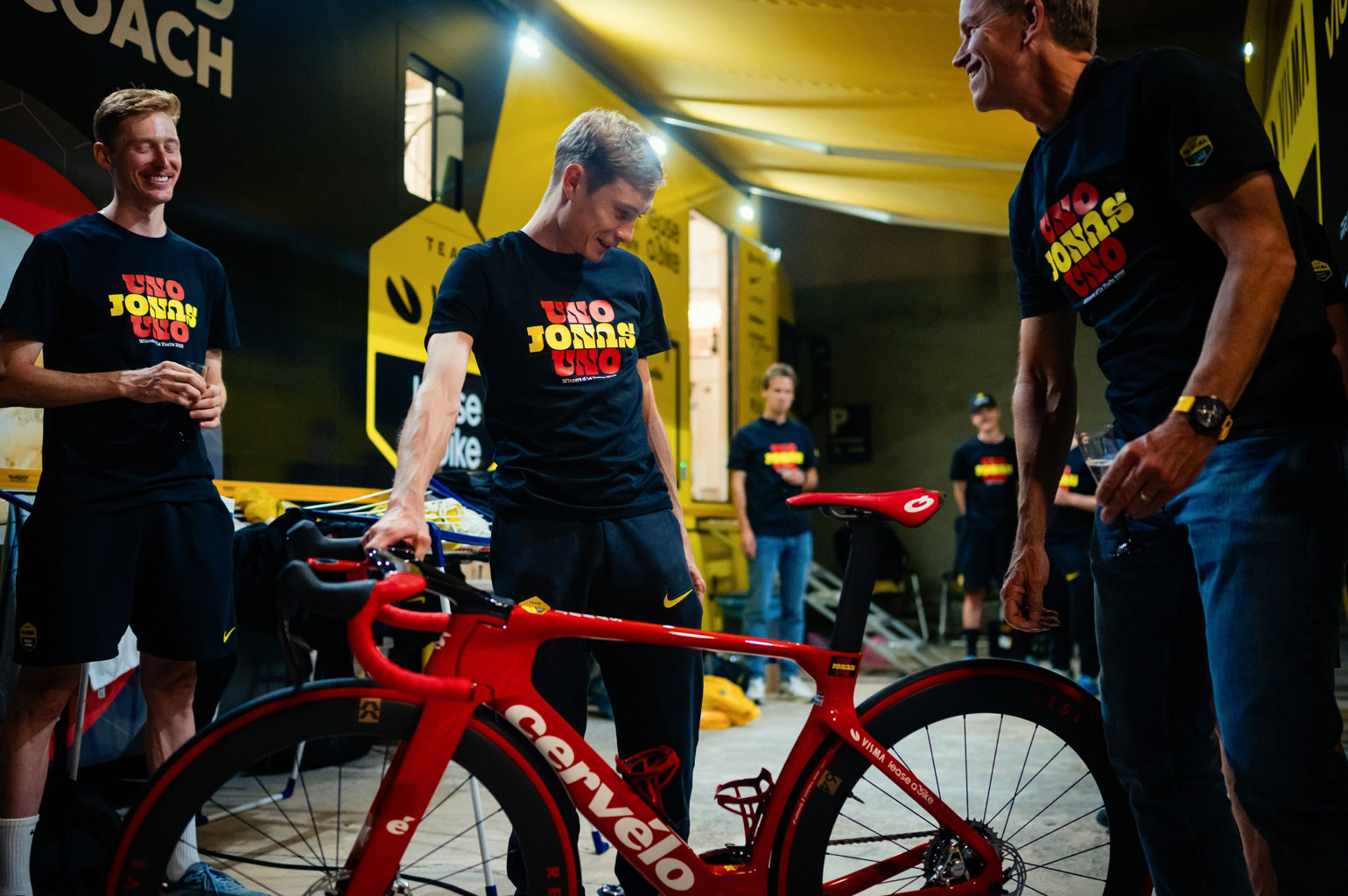 En Vingegaard?… die is er zo te zien erg blij mee.