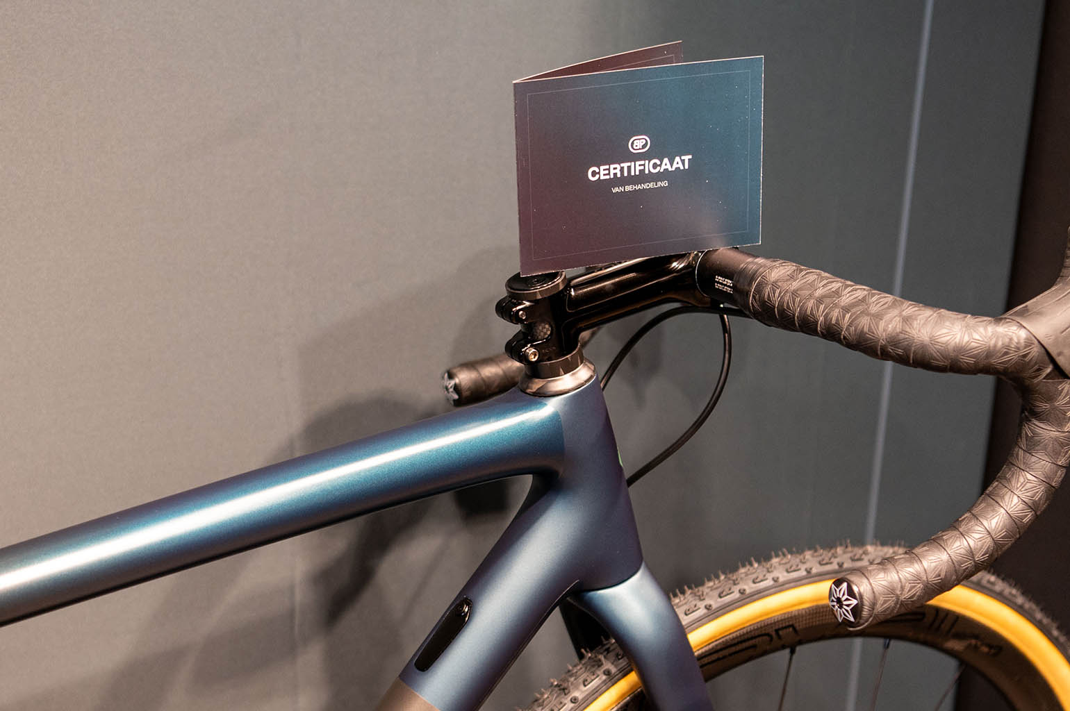 De coating wordt overigens niet alleen op het frame en de wielen aangebracht, maar ook de onderdelen worden meegenomen. Dus ook je shifters, crankset en derailleur krijgen een extra beschermlaagje! Nu is zo’n coating niet eeuwigdurend, want dat slijt langzaam. De werking zou in een jaar tijd zo’n 20% afnemen, waarnaar je bij Bike Protector een coating update zou kunnen doen. Na een behandeling krijg je een certificaat mee, waarop de behandeling en de datum staat zodat je altijd weet wanneer je fiets onder handen is genomen.