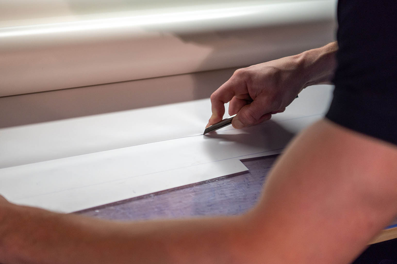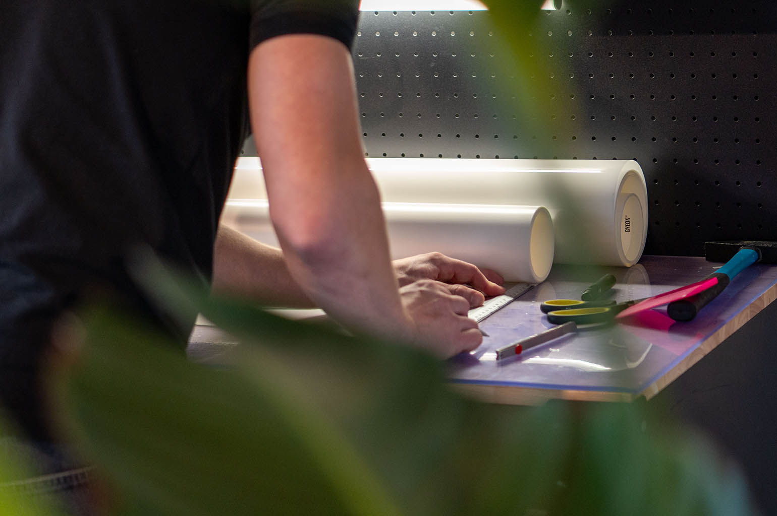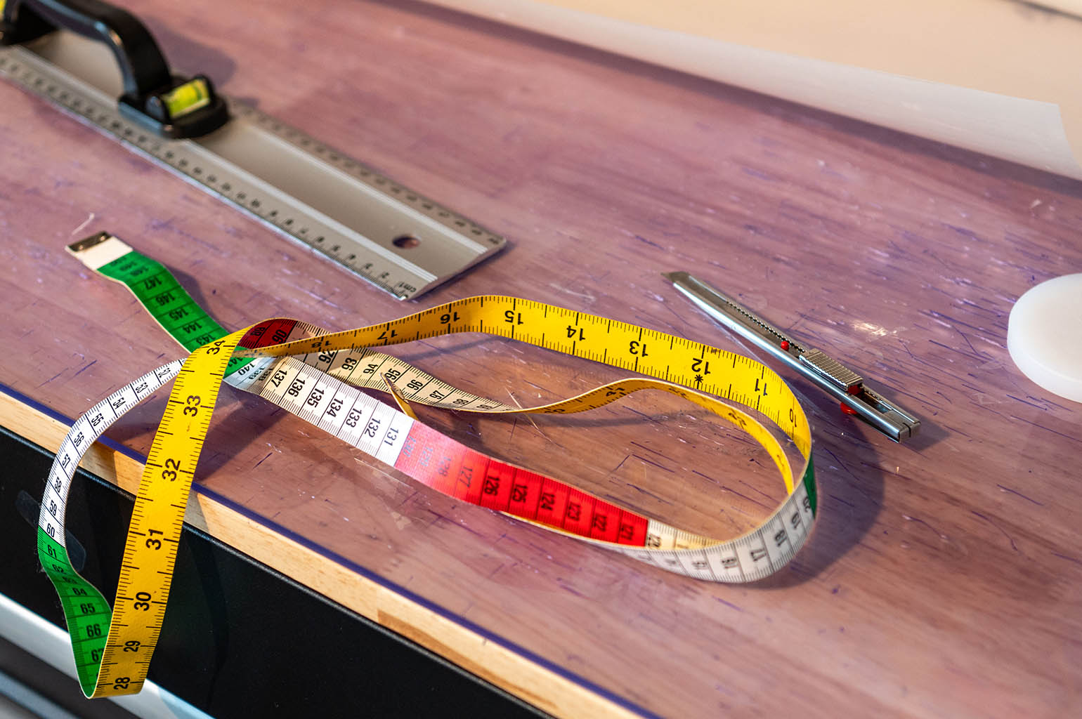 Met een meetlintje dat ik nog ken van het naai-setje van m’n moeder, meet Dion als eerste de bovenbuis op. Klinkt simpeler dan het is, want de buis is niet overal even dik. De gehele bovenbuis wordt voorzien van PPF, dus hij moet zowel bij het balhoofd als de zadelpen mooi aansluiten. Dus naast de omtrek en lengte, moet Dion ook rekening houden met het verschil in diameter. Met alle maten in z’n hoofd gaat Dion naar de snijtafel, waar hij de matte folie heel secuur op maat snijdt. En dan zie je wel hoe precies Dion te werk gaat, en dat het echt specialistisch werk is. Eerst even ‘droog’ passen of de folie op maat is. Voordat de folie daadwerkelijk op het frame wordt aangebracht, wordt het frame nog eerst extra schoongemaakt met een alcohol oplossing. Daarna wordt de onderbuis natgemaakt en wordt de folie aangebracht.