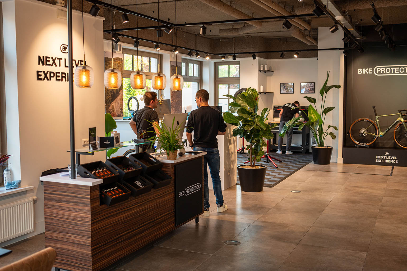 De winkel van Bike Protector zit dus in het centrum van het Twentse Enter en heeft een mooie luxe uitstraling. Als je binnenkomt zie je dan ook een aantal hele dikke fietsen staan, die door Dion al zijn gecoat en in de folie zijn gezet. Hun belangrijkste business is het detailen en daarvoor gebruiken ze alleen maar hoogwaardige producten uit de auto-industrie. De PPF folie en coating die op mijn fiets komt, wordt bijvoorbeeld ook gebruikt op auto’s van Porsche.