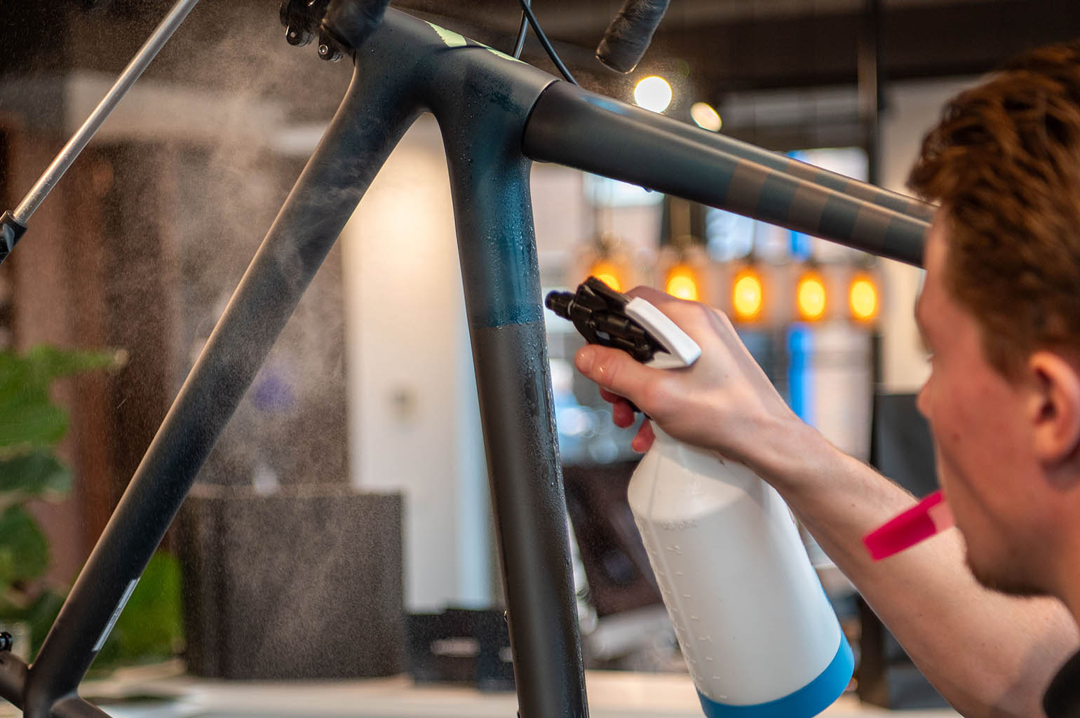 De winkel is overigens geen plek waar fietsen gerepareerd kunnen worden. Sterker nog, fietsgereedschap zal je er nauwelijks niet vinden. Het moet een cleane en schone werkplek zijn, want vet en vuil zijn uit den boze bij het coaten en detailen van je fiets. Bike Protector werkt met een aantal fietsenzaken samen. Nieuwe fietsen worden in overleg geleverd zonder crankset en ketting. Niet alleen om alles vetvrij te houden, maar ook zodat Dion rondom het bracket goed kan coaten en eventueel folie kan aanbrengen. Maar je kan zelf ook je complete fiets afleveren om te laten behandelen. Net wat jij wil.