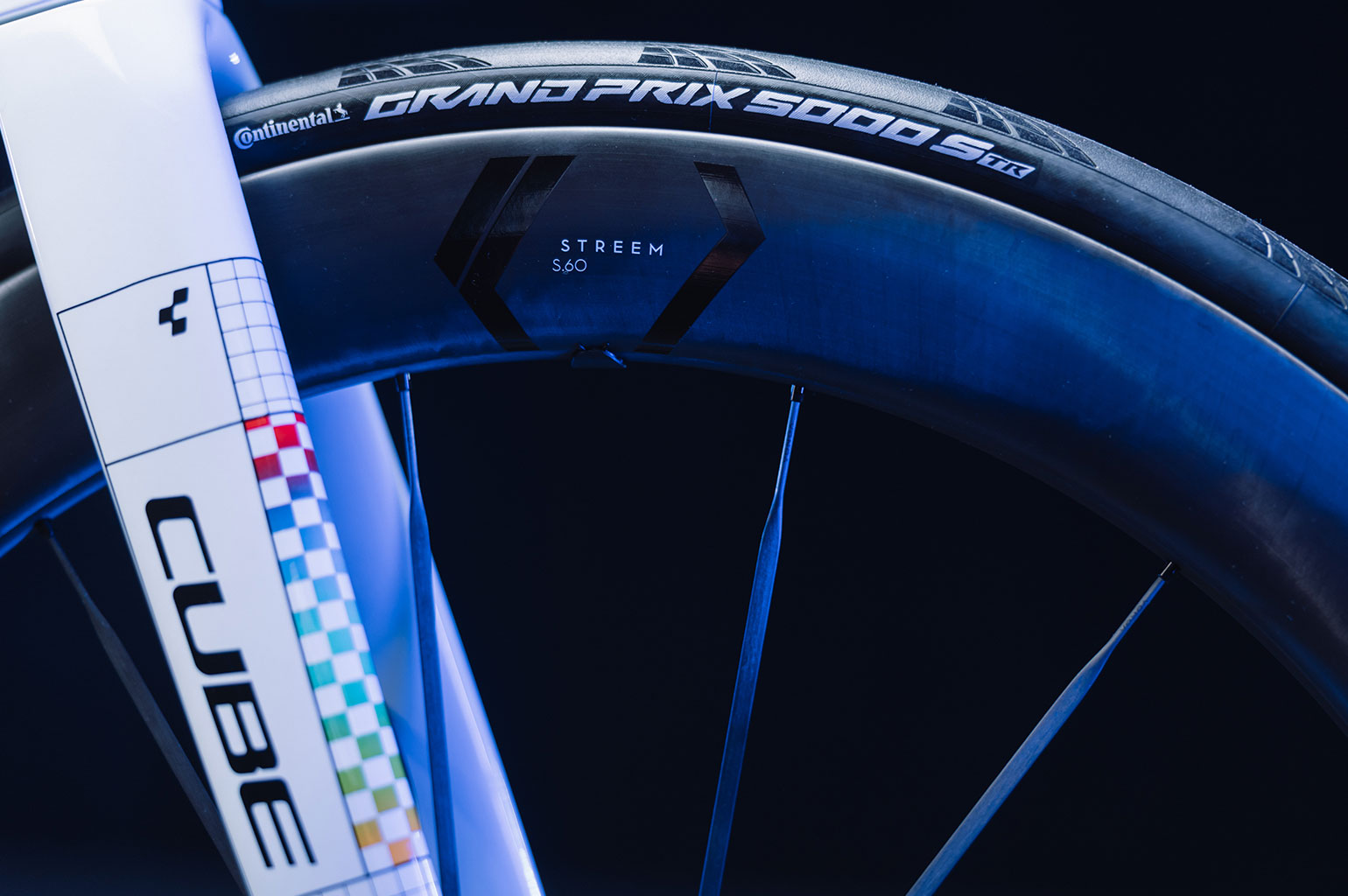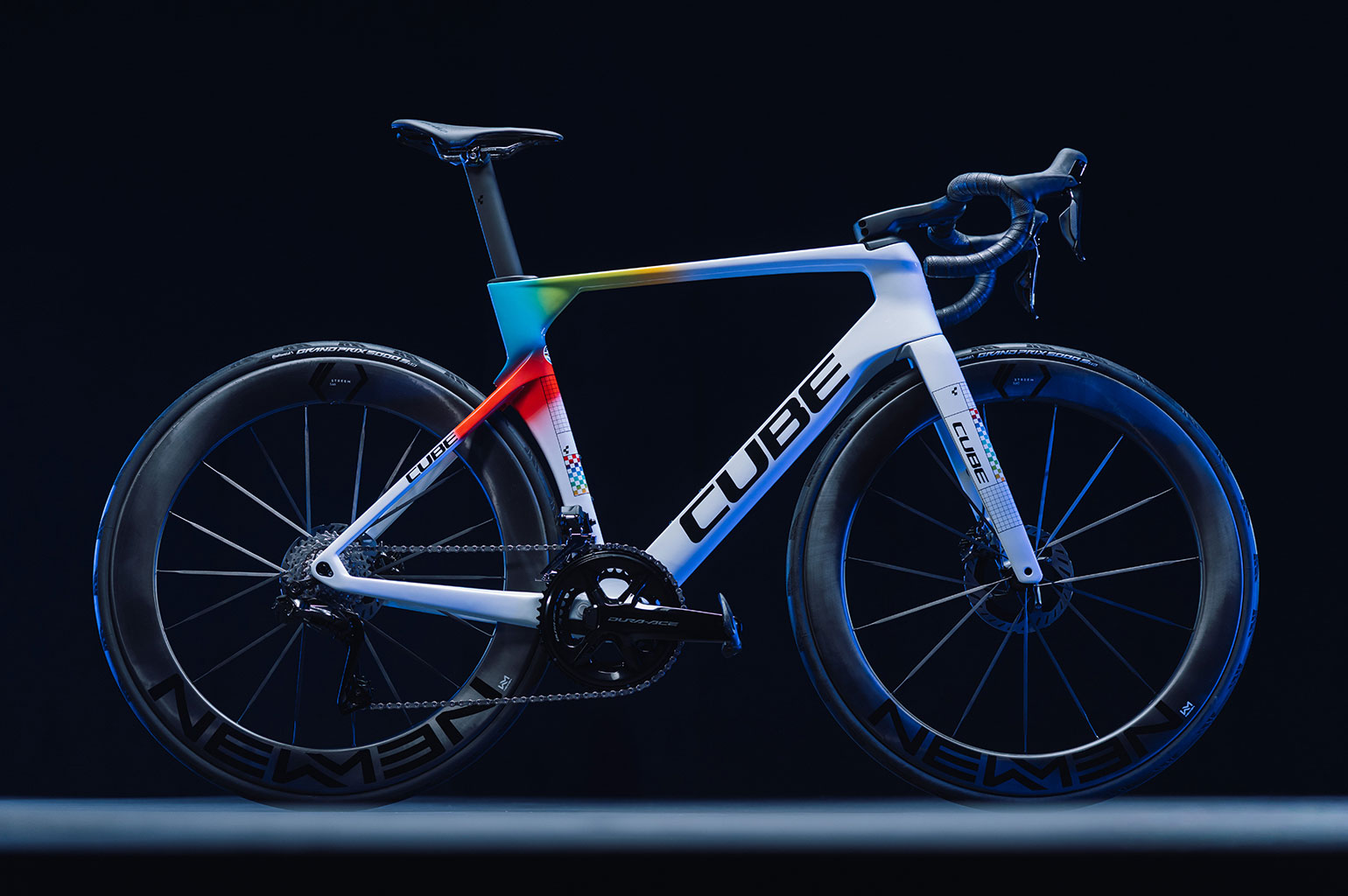 Op de foto’s zie je de Cube Litening Aero gemaakt van C:68X carbon, die een iets dikker aero frame heeft dan de Litening Air. De fiets is verder afgemonteerd met Shimano’s topgroep: Dura Ace Di2 en de Newmen Streem S.60 wielen.