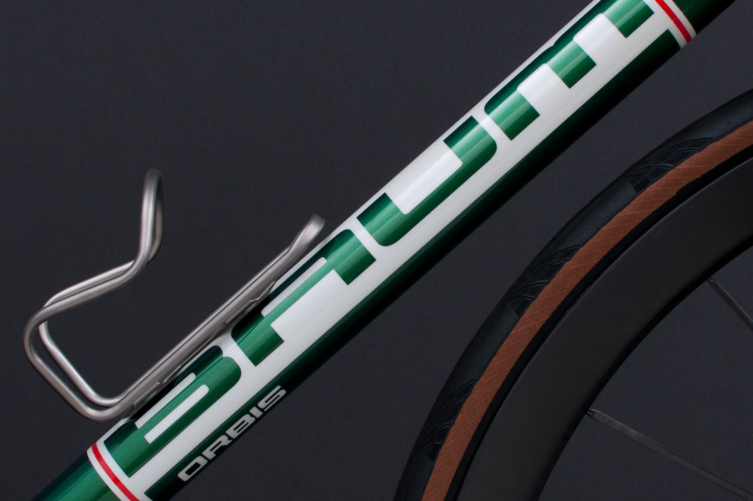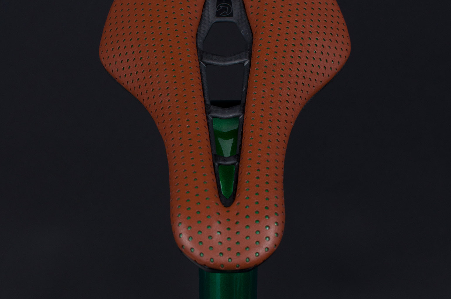 De kleurstelling heeft de namen: Poison Ivy, Signal Red en Off White Pearl gekregen. Ja, ik moest ook even zoeken naar het Signal Red, maar het zit er toch echt. De titaniumkleur zie je nog terug op de achtervork. De cockpit en de zadelpen zijn netjes meegespoten in het groen en door de interne kabelgeleiding ziet het geheel er heel modern uit. Maar toch krijg ik een klassiek gevoel bij deze Orbis. Dat komt namelijk door het zadel en het stuur. Deze zijn bekleed door Busyman. Zij zijn goed met leer en deze whiskeykleurig kangaroo-leer past wel erg goed bij het groen. Als je goed kijkt, zie je in de gaatjes van het leer dezelfde groene kleur als het frame. De bruine wangen van de banden complementeren het geheel. Super gedaan.