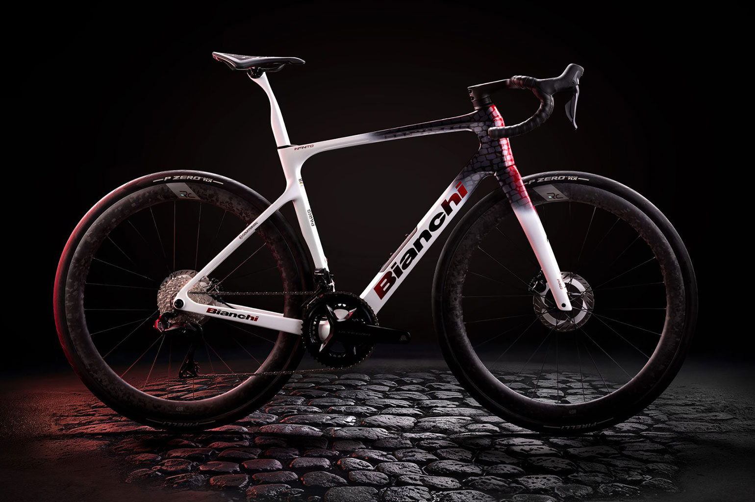 De fiets is verder opgebouwd met Reparto Corsa onderdelen zoals de Cockpit en de wielen. Dit zijn onderdelen uit Bianchi’s eigen fabriek. De Shimano Ultegra Di2 groepset komt met een dubbele powermeter en de prijs van deze Infinito is € 7.950,-.