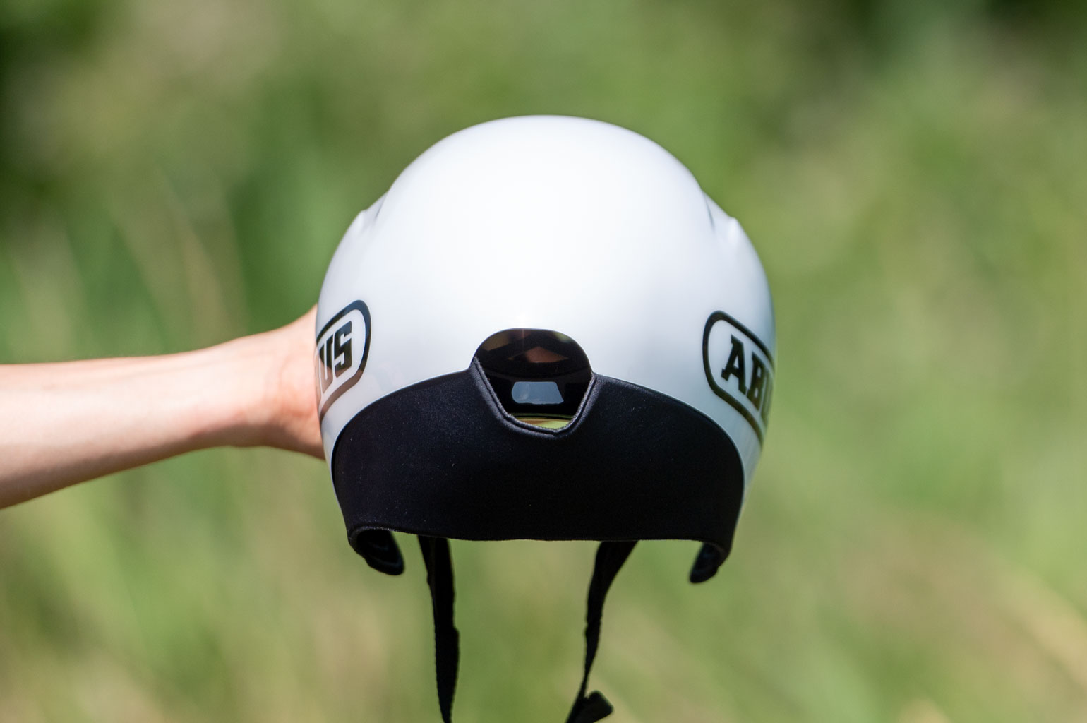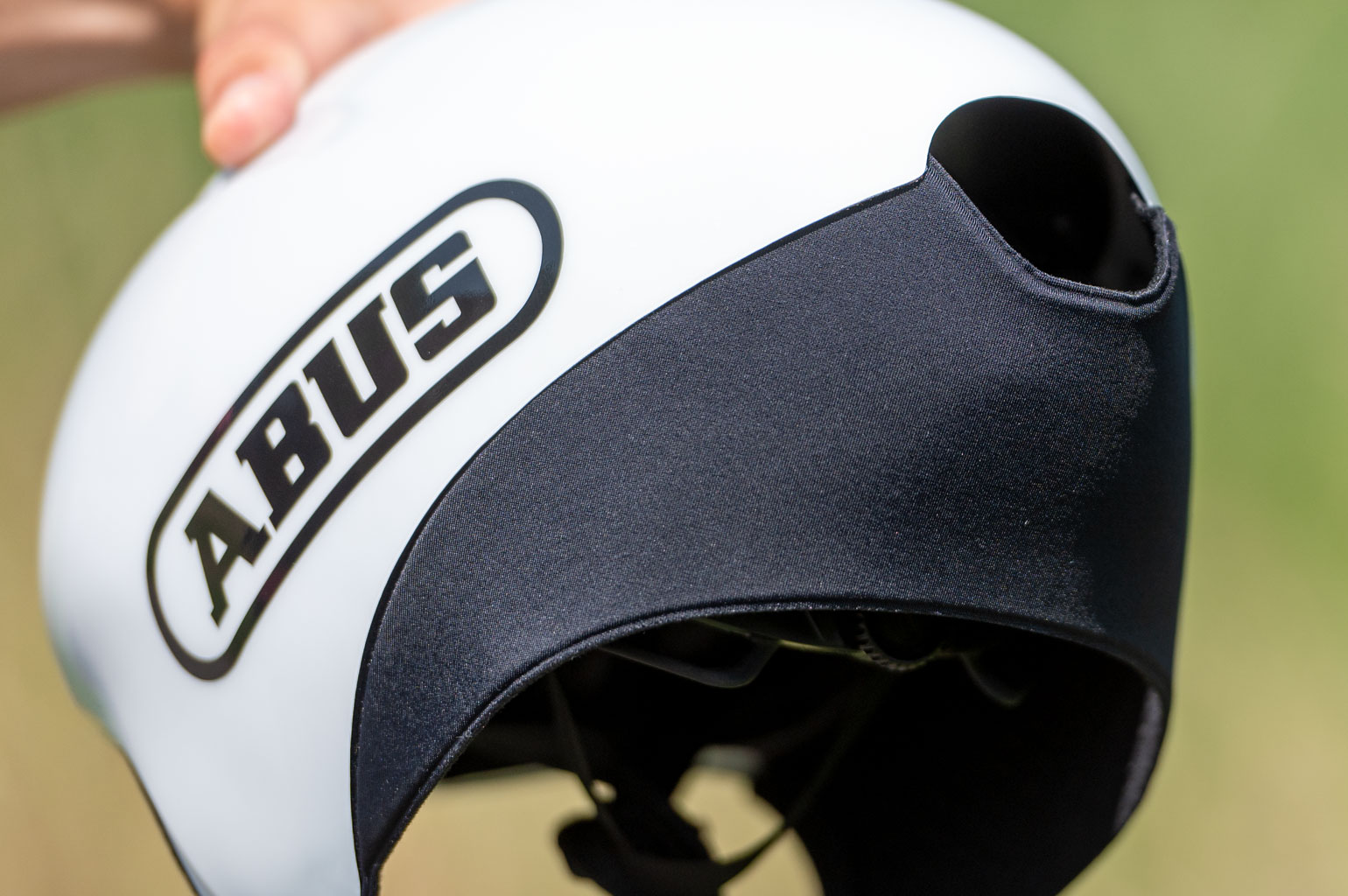 Dat het een opvolger is van de GameChanger TT is niet te ontkennen. De gelijkenis is groot, maar als je er wat langer naar kijkt, zie je wel degelijk verschillen. Dat kan je het beste zien aan de achterkant, waar ABUS de schaal van de helm verder heeft doorgetrokken. Deze zogeheten EVA-Tail is deels van een stevige maar flexibele stof. Deze moet ervoor zorgen dat de helm goed aansluit in je nek, wanneer je in de tijdrithouding zit. Door de flexibele achterkant kan je je hoofd in verschillende houdingen houden zonder dat dit ten koste gaat van de aerodynamica, volgens ABUS. Aan het einde van de helm zit een ronde opening, zodat de warme lucht kan worden afgevoerd. Frisse lucht stroomt naar binnen via de sleuf aan de voorkant.