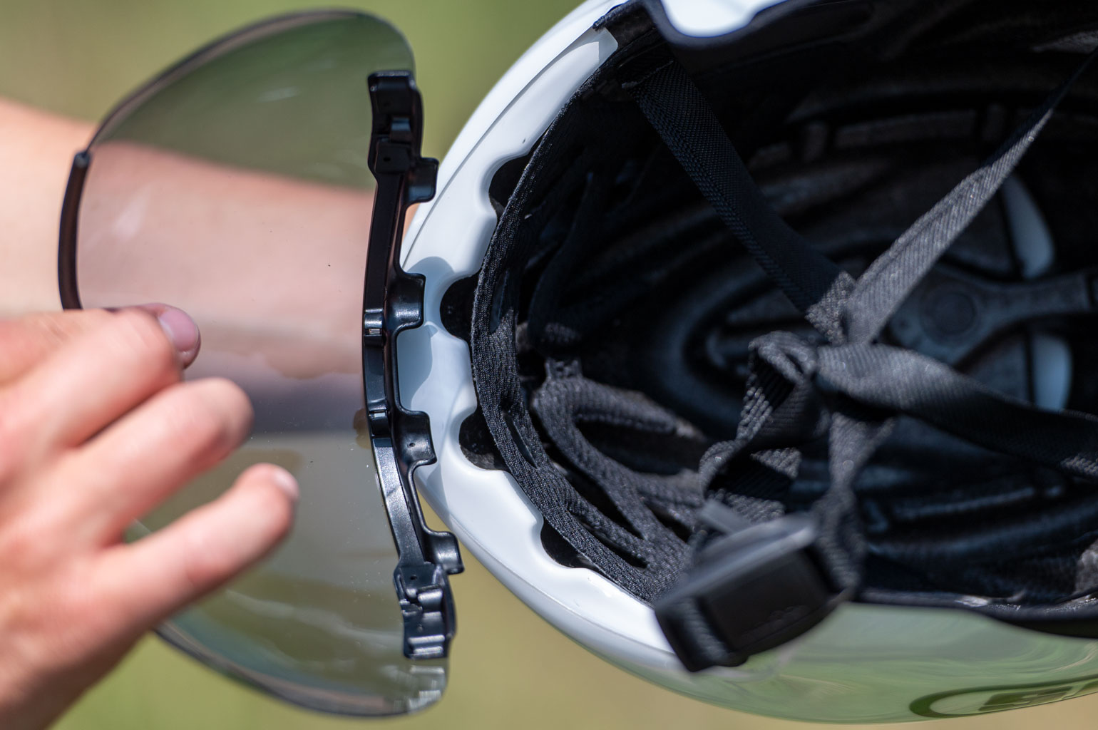 Die kracht van de magneetjes merk je ook in het vizier. Daar zitten vier magneetjes in, die het vizier heel stevig op de helm klemmen. Het vizier heeft een uitsparing zodat het over je neus valt. Daar zit een klein rubber stripje over de rand. Niet dat deze heel scherp is, maar dit geeft wel een beetje bescherming. De onderkant van het vizier zit net niet tegen de wangen aan, waardoor het mooi aansluit en weinig ruimte laat voor de wind. Hoe minder kieren of openingen tussen je hoofd en de helm, des te beter de luchtstroom rondom de helm.