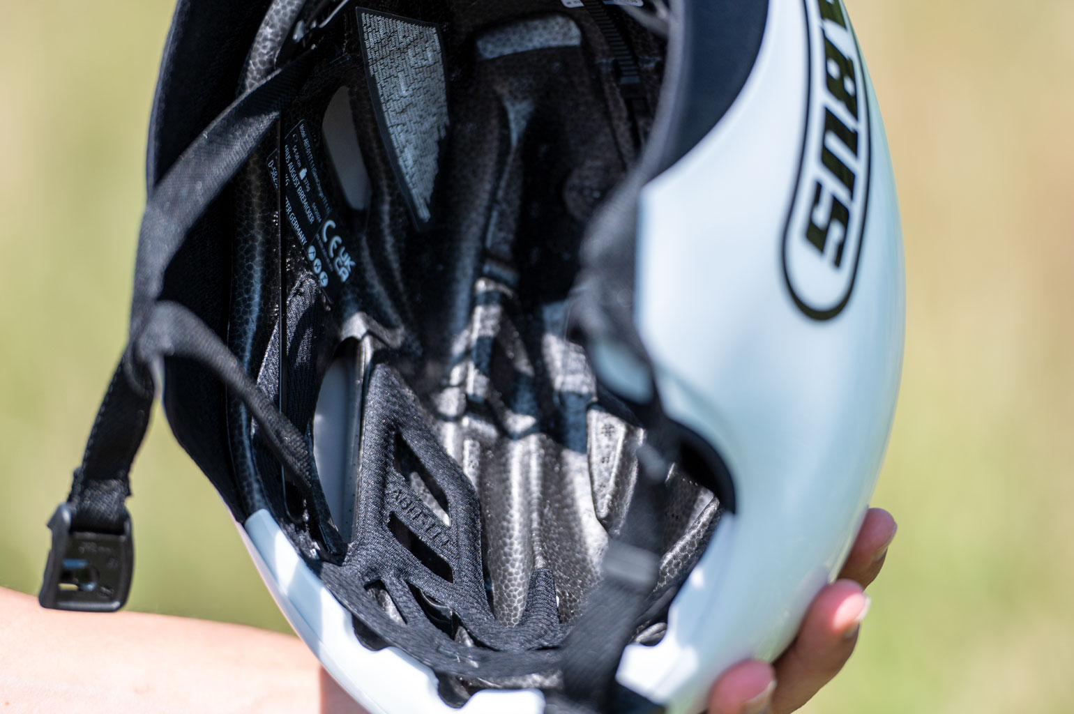 Het vizier is hetzelfde als bij zijn voorganger, maar sluit beter aan op de schaal van de TT 1.1-helm. Hier zit een klein randje in, waar hij overheen valt. Dit zal ervoor moeten zorgen dat de wind beter om de helm wordt geleid. Aan de voorkant van de helm zie je de sleuf die je kent van de allereerste GameChanger uit 2017. Het verschil is dat de gestroomlijnde rand niet helemaal doorloopt tot het eind. Als je aan de binnenkant van de helm kijkt, zie je een vergelijkbare binnenkant met de GameChanger TT. Zoals ik in het vorige artikel ook schreef, is de binnenschaal van de helm 8 graden gekanteld, zodat hij beter aansluit in je nek wanneer je in de tijdrithouding zit.
