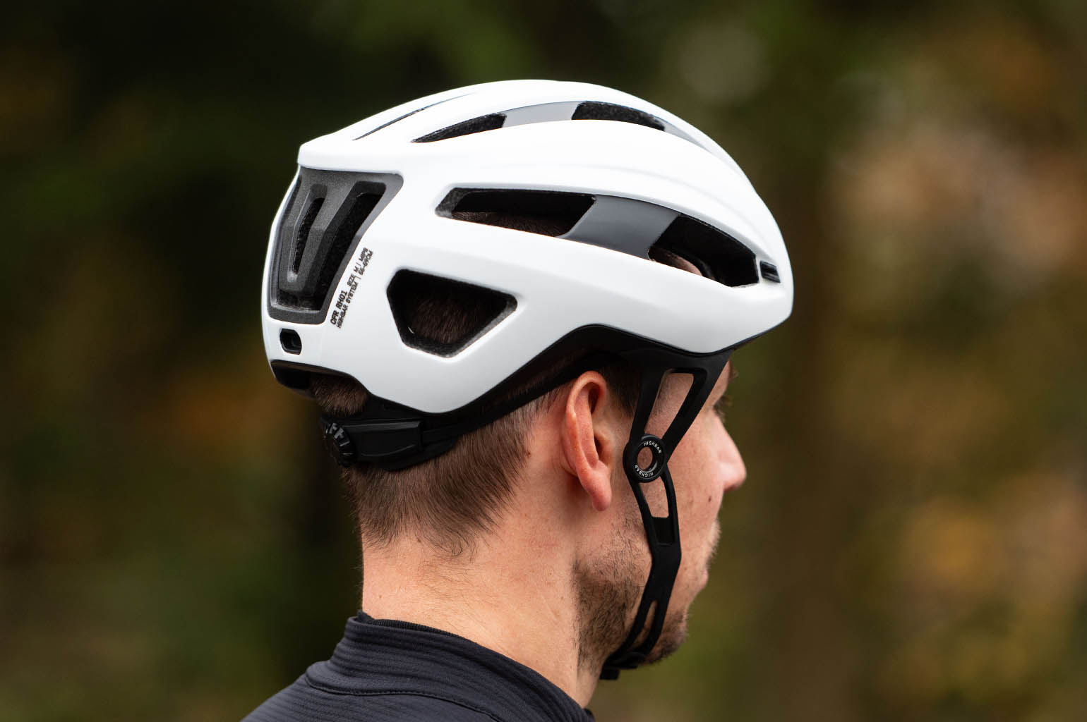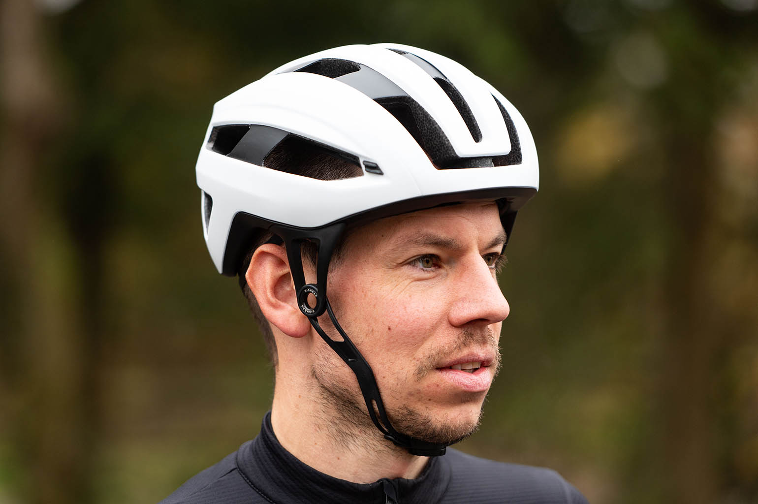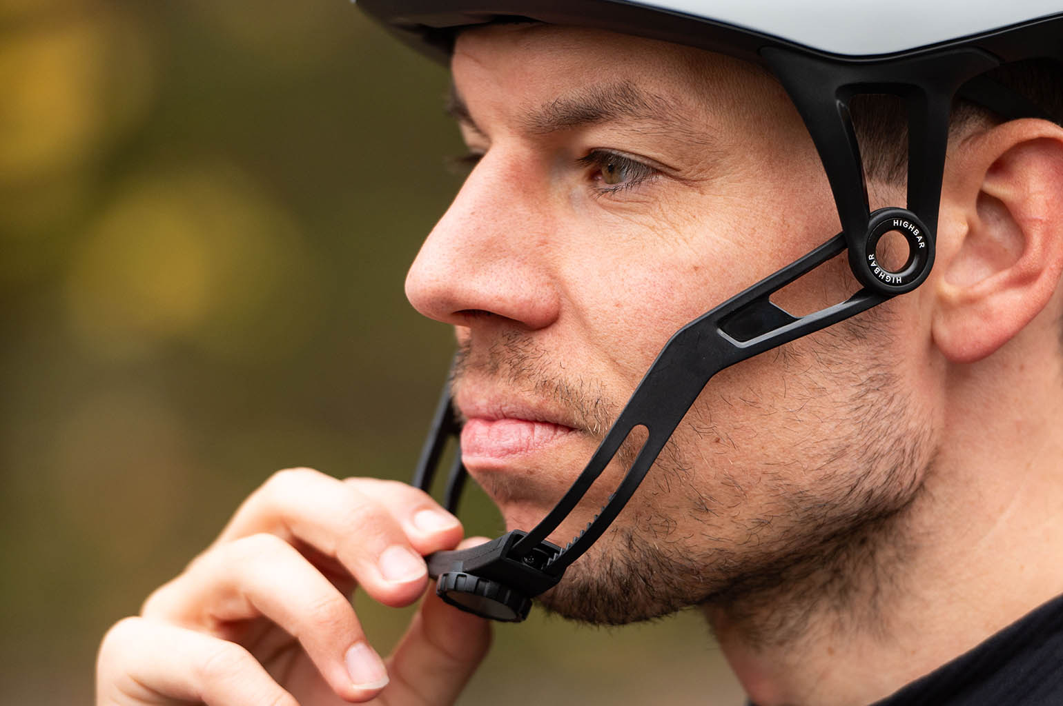 Ik merk dat ik de gehele testperiode wel zoekende ben naar de goede afstelling van de HighBar. Als ik ‘m strakker draai zodat hij net mijn kin aanraakt, kan ik mijn mond amper open doen zonder dat de helm begint te bewegen. Iets losser is wat dat betreft ideaal zodat ik ook onderweg kan eten en praten. Maar dan kan ik de beugel ook over mijn kin draaien en dat is niet de bedoeling van een sluiting. Ook merk ik dat de onderkant van de beugel op m’n adamsappel drukt als ik naar beneden wil kijken. Dit is een verschil met de straps van andere helmen, die zijn veel soepeler en vallen daardoor beter over de verschillende gezichtsvormen. De HighBar beugel heeft namelijk maar een vorm en zelf hier op kantoor merk je al verschil. Bij Björn zit deze beugel al veel minder in de weg tijdens het naar beneden kijken.