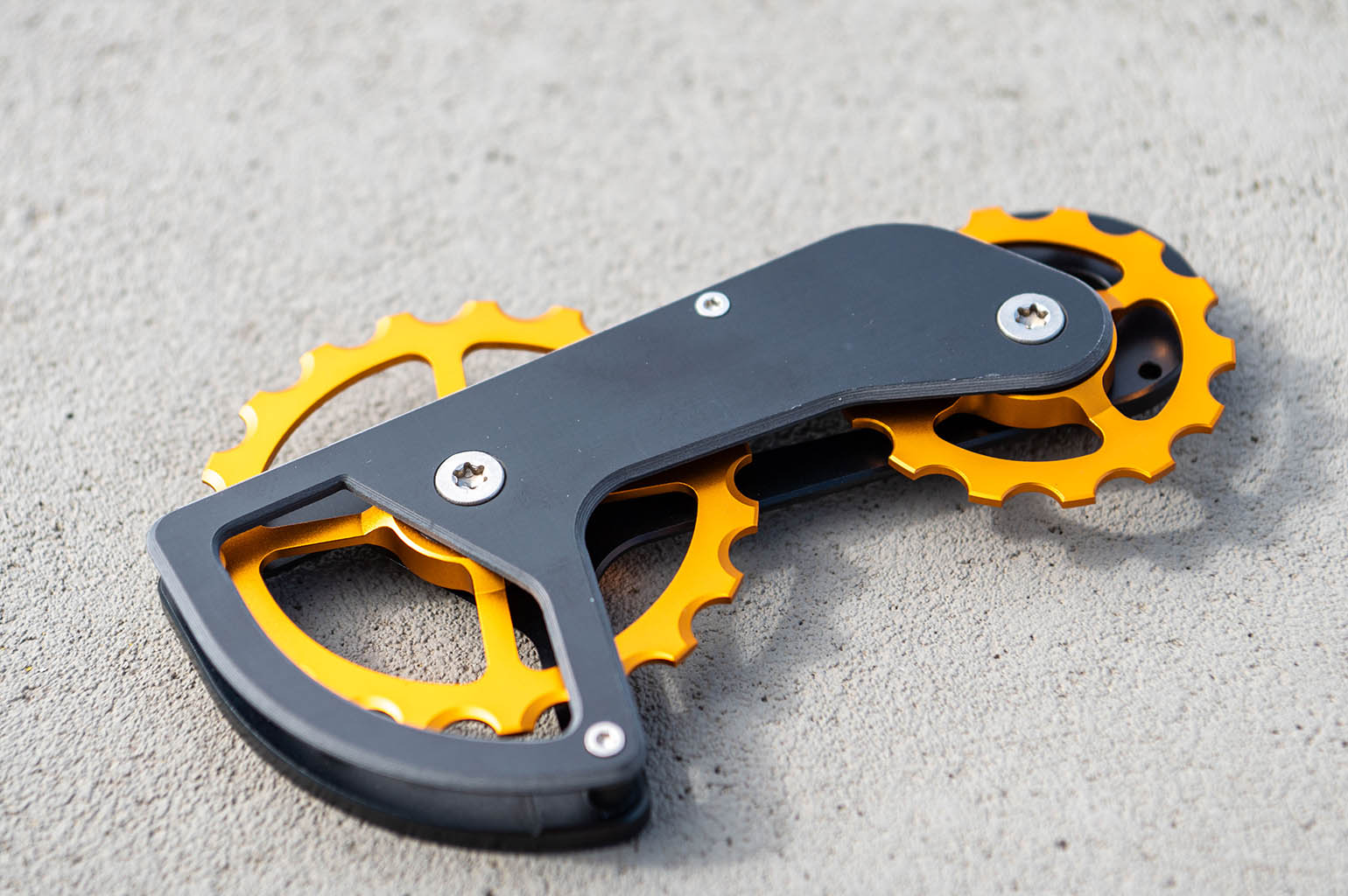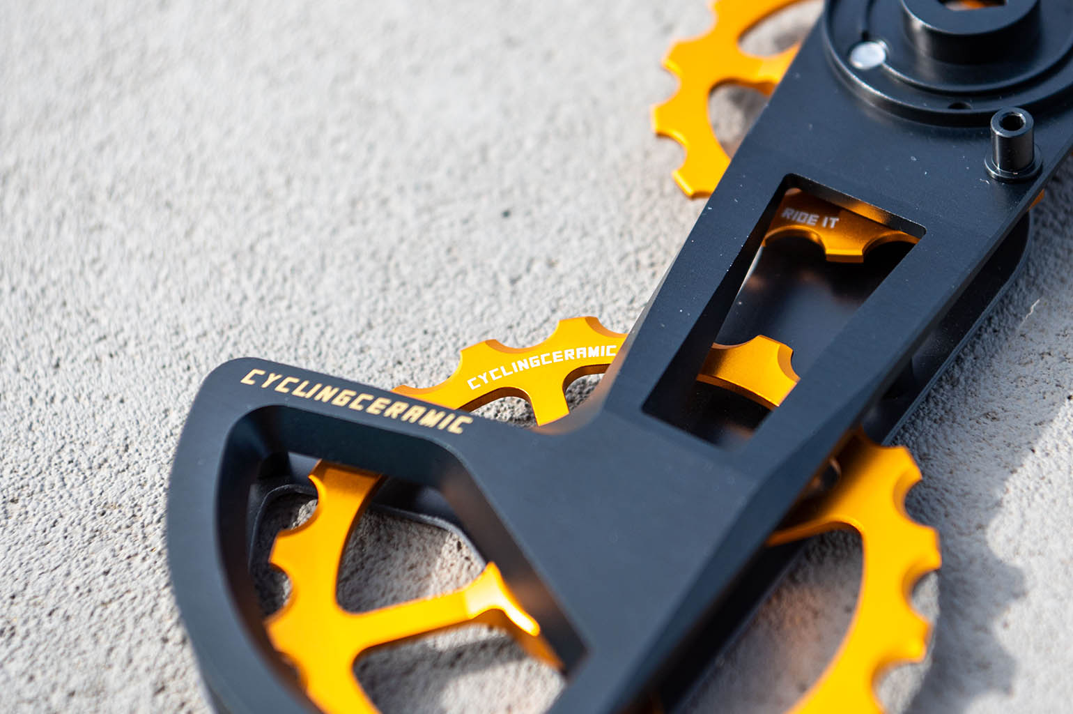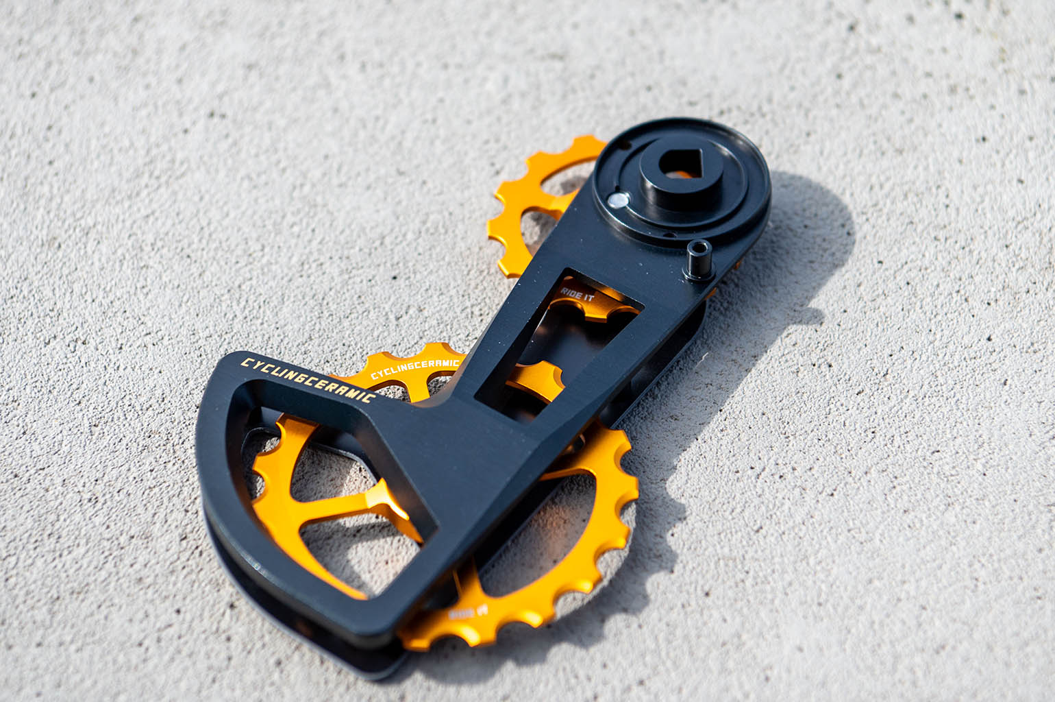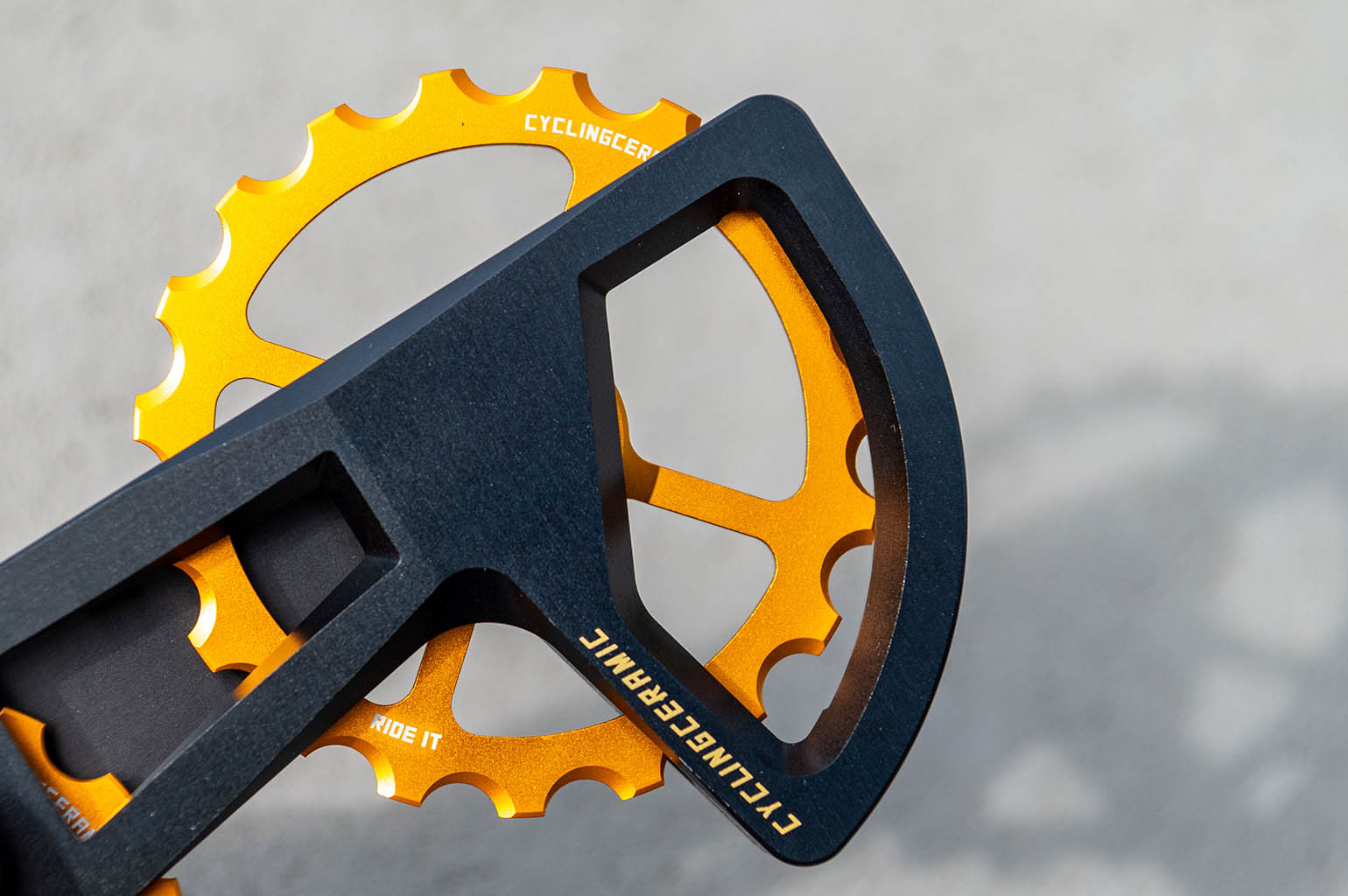 Deze is er in vier kleuren: helemaal zwart, met blauwe wieltjes, met rode wieltjes en met de goudkleurige wieltjes. Die laatste kleur zie je terug op de foto’s. Omdat deze producten altijd best een uitgave zijn, is het misschien goed te weten dat deze CyclingCeramic kooien scherp geprijsd zijn. Al is € 289,- nog steeds een flinke uitgave voor een derailleurkooi.