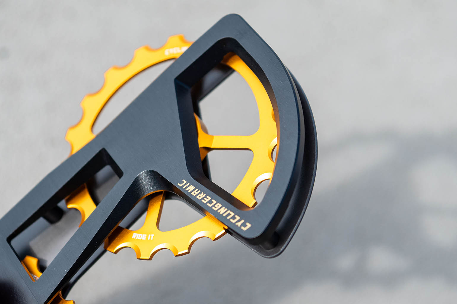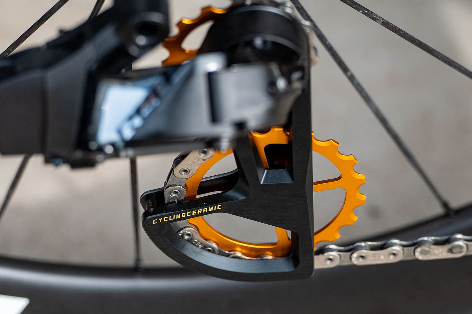 Het voelt als een luxeproduct, zo’n oversized derailleurkooi met keramische lagers. En dat is het ook wel. Er zijn twee redenen waarom je jezelf zoiets cadeau doet. In willekeurige volgorde zijn dat het esthetische en het functionele aspect. Het eerste omdat je je racefiets net even specialer maakt. Want die grote derailleurwieltjes vallen op, zeker als je ze in een kleurtje kiest. Als tweede is er het functionele dat je vooral voelt door de lichtlopende wieltjes. Dat scheelt weerstand en dus maakt het je sneller. Deze CyclingCeramic OSPW derailleurkooi is zo’n upgrade. Hierbij staat OSPW voor Oversized Pulley Wheel System.