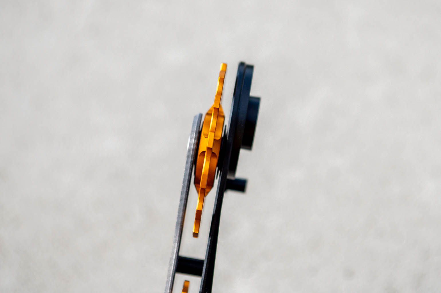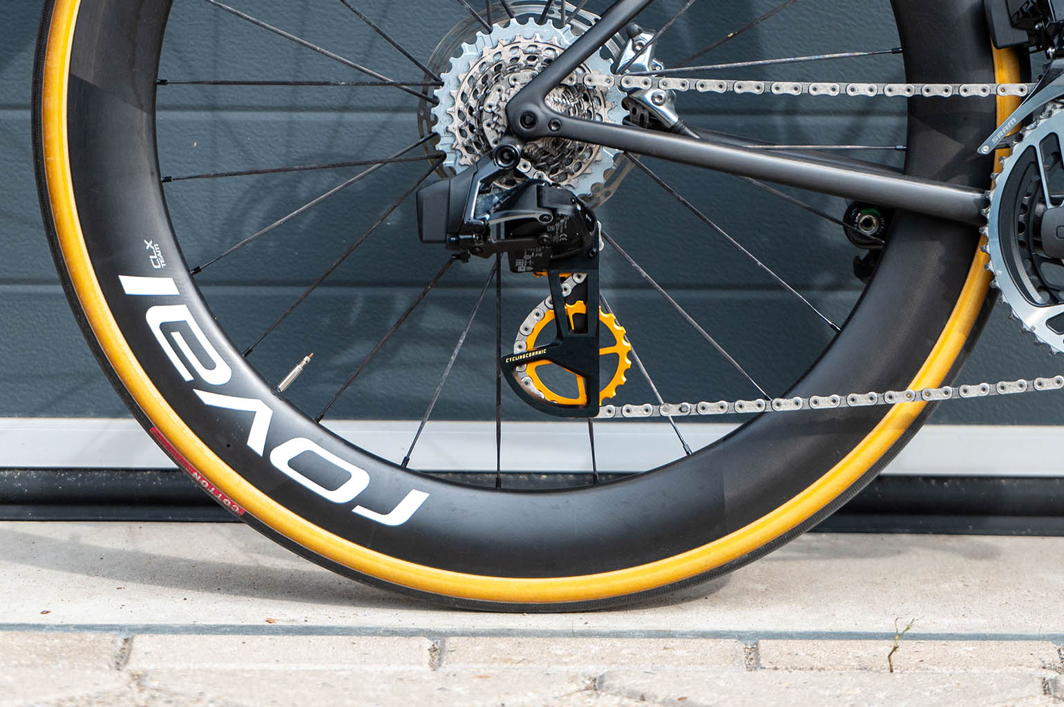 Nou heb ik de zwarte kooi met de gouden wieltjes, en dat leek op papier een fijne keus. Maar nu ik er een tijdje mee fiets merk ik dat ik toch liever voor de zwarte versie met zwarte wieltjes was gegaan. Niet omdat het goud niet mooi lijkt, juist wel. De kleur is alleen veel gevoeliger voor het vet van de ketting. Je krijgt snel een zwart randje op de gouden wieltjes, daar waar de ketting deze raakt. Dat zie je met zwarte wieltjes niet zo. Dus ik maak nu iets vaker mijn derailleurwieltjes schoon.