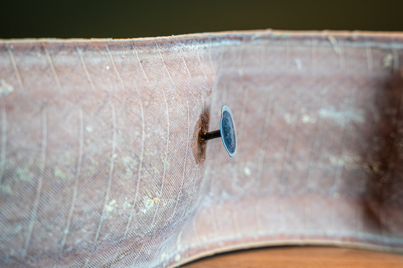Als ik de plek van het gat heb ontdaan van sealant resten, kan ik de Pro-plug kiezen die het best het gat in de band vult. De diameters zijn 3 mm, 3,5 mm en 4,5 mm. In de praktijk zul je zien dat het gat meestal niet rond is, waardoor de diameter van het plakgedeelte eigenlijk belangrijker is. Ook ligt het sterk aan het profiel van de band. Op deze kapotte Specialized Pathfinder gravelband zit een fijn profiel en het gat is zo’n 5 mm. Ik koos dus voor de plug van 3 mm.