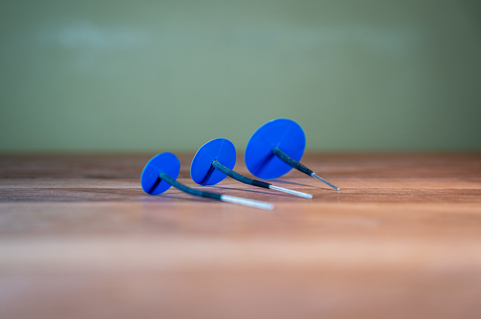 Toch zijn die pluggen niet erg betrouwbaar op lange termijn, want dat propje kan gaan bewegen of als de sealant opdroogt ontsnapt alsnog de lucht. Lezyne-set gaat bij deze Tubeless Pro Plugs uit van ongeveer hetzelfde principe, maar dan van binnenuit. In het doosje krijg je zes Pro-plugs in drie maten. Dat zijn in feite traditionele bandenplakkers, met een rubber sprietje eraan. Aan het uiteinde zit een ruwe naald van metaal, waarmee je makkelijker door het gat prikt.