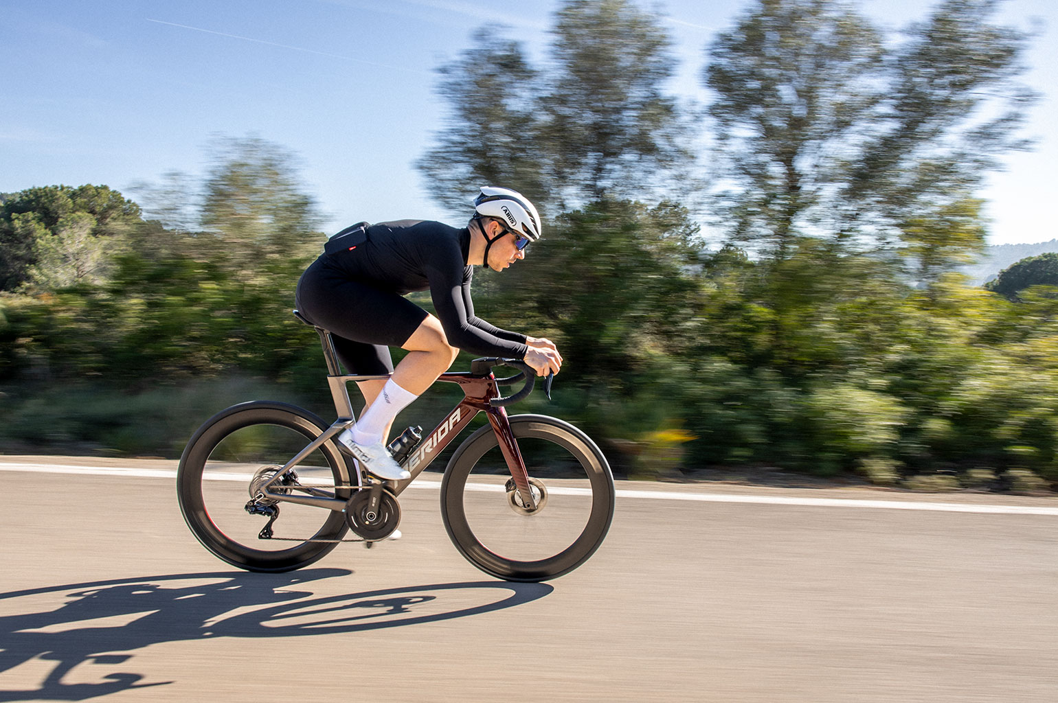 Merida heeft voor de nieuwe Reacto drie ’topmodellen’. Het frame, dat is gemaakt van hoogwaardig CF5-carbon, kent drie verschillende setups. Daarbij is de Reacto One, die ik heb gereden, de snelste uitvoering en met deze setup heeft Merida de 200-wattbarrière weten te doorbreken! Uit de test komt namelijk 196 watt, bij een gewicht van 7,4 kg. De kanttekening daarbij is dat dit wel is met de smalle cockpit, dat niet in koers gebruikt mag worden. De fiets is verder afgemonteerd met een ‘1-by’ Shimano Dura Ace Di2-groepset in combinatie met Classified en Rotor Alduh crankset. De combinatie van een aerodynamisch voorblad en het weglaten van de voorderailleur verlaagt de weerstand. Hierdoor heb je een aerodynamisch voordeel én wel het volledige bereik van 24 versnellingen.