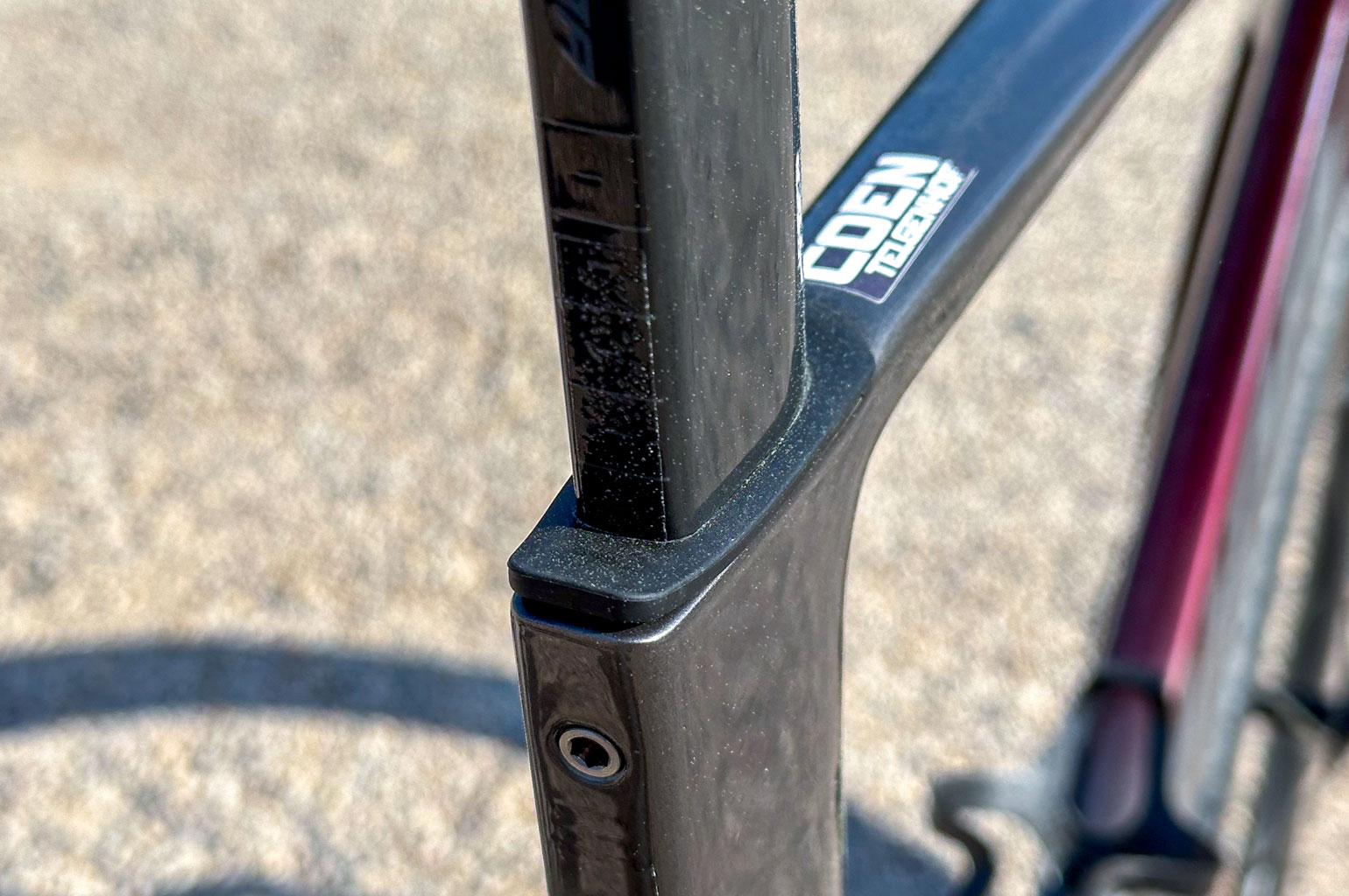 Gewicht hebben ze op ander plekken dan weer weten te winnen zodat de totale besparing dus op 108 gram uitkomt. De zadelpen is veel smaller geworden, maar heeft nog altijd de S-Flex-techniek voor extra demping. Merida heeft aan de onderkant bij het bracket een ruimte ontwikkeld waar de (Shimano) batterij onder in het frame wordt gemonteerd. Doordat deze dus niet meer in de zadelpen zit, is deze zo smal mogelijk gemaakt. Dit is aerodynamisch veel voordeliger, maar ook lichter. Praktisch is er onderaan een klepje gemaakt, zodat je makkelijk bij de batterij kan mocht dat nodig zijn.