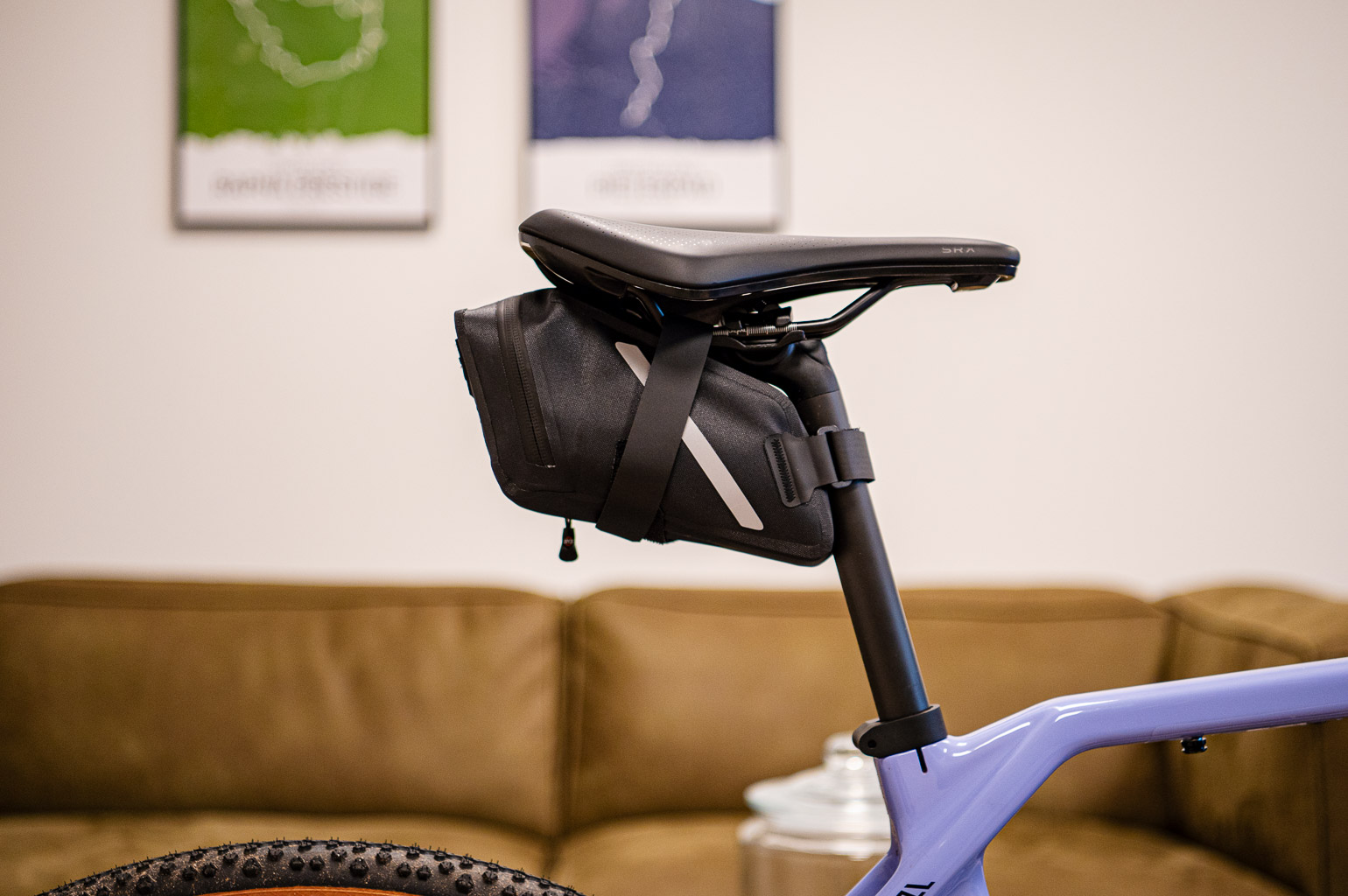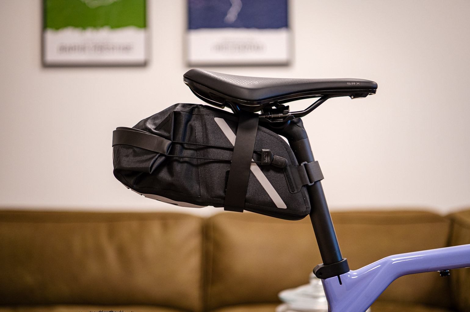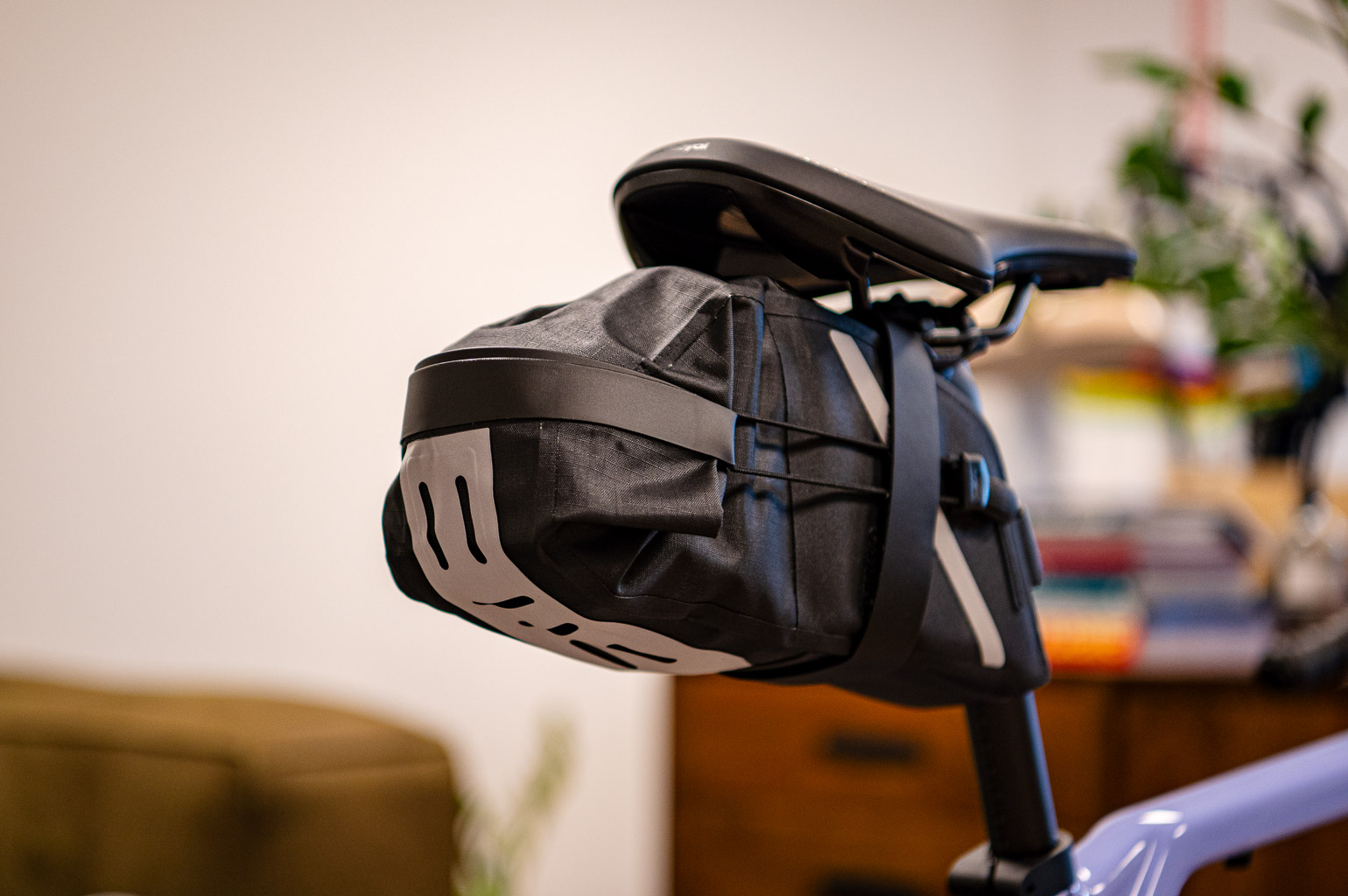 De drie zadeltasjes die ik met elkaar vergelijk, hebben allemaal dezelfde bevestiging. Aan de bovenkant van het tasje zit een lusje, waar een klittenband-strap doorheen loopt. Dat bandje zit los en is vervangbaar. Op de zijkant van het tasje zit ook klittenband zodat het bandje goed op z’n plek blijft zitten. De klittenband-strap maak onderaan het zadeltasje aan elkaar. Voor alle drie de modellen geldt dat je ze moeilijk echt op spanning kunt trekken, maar ze zitten stevig genoeg. Ook als ze met gewicht gevuld zijn. Daarnaast heeft elk zadeltasje reflecterende details, en een lusje op de achterkant voor een klein achterlichtje.