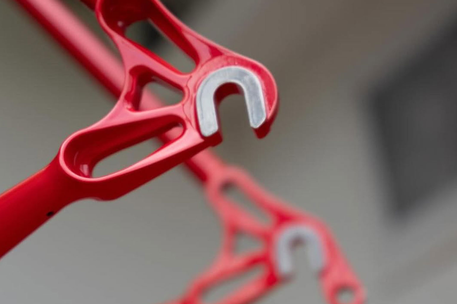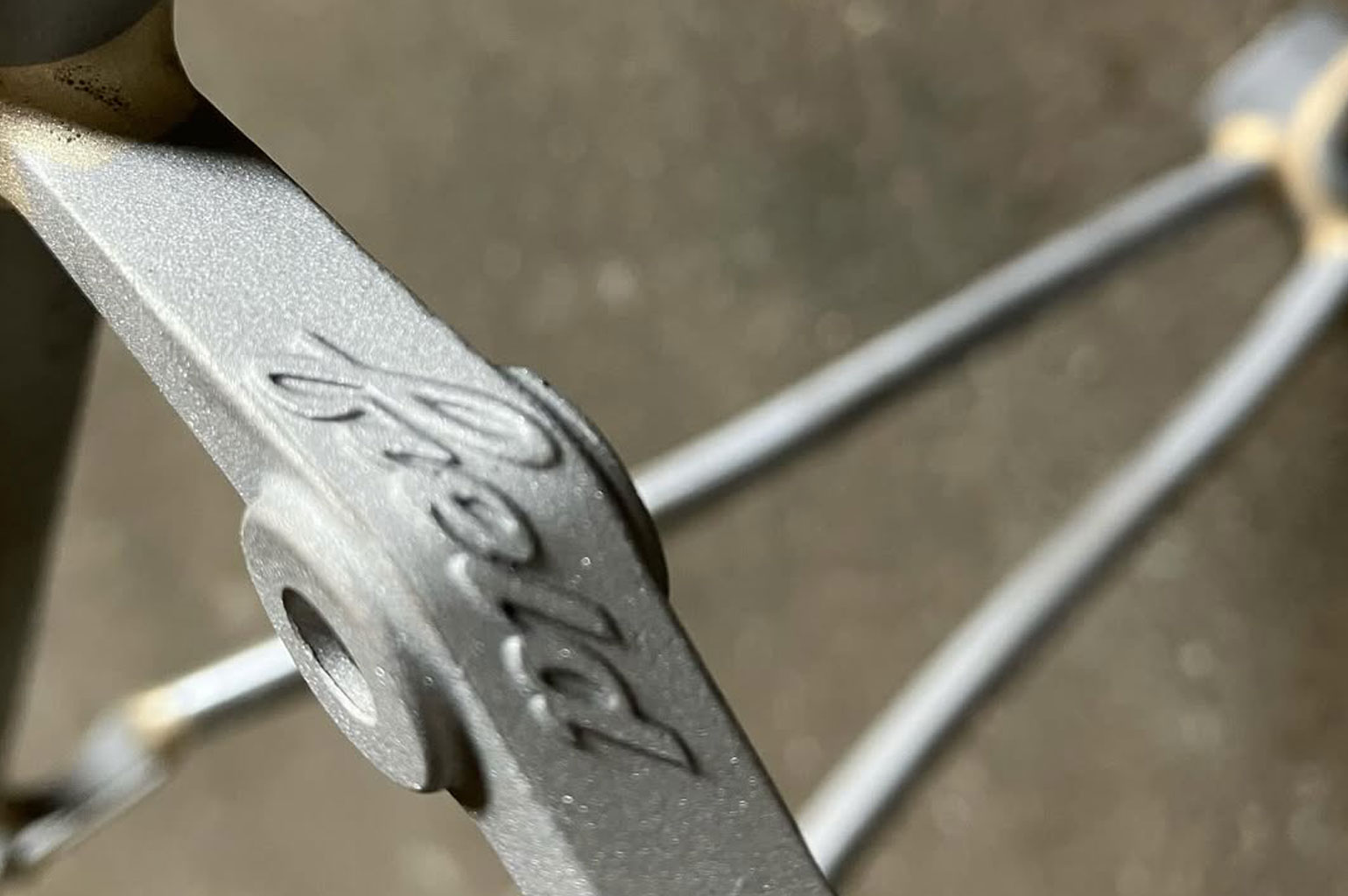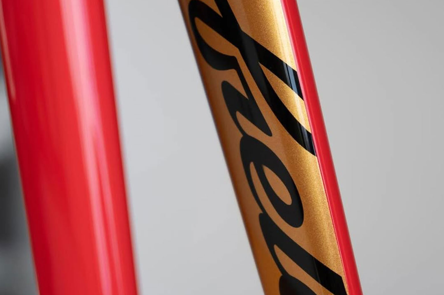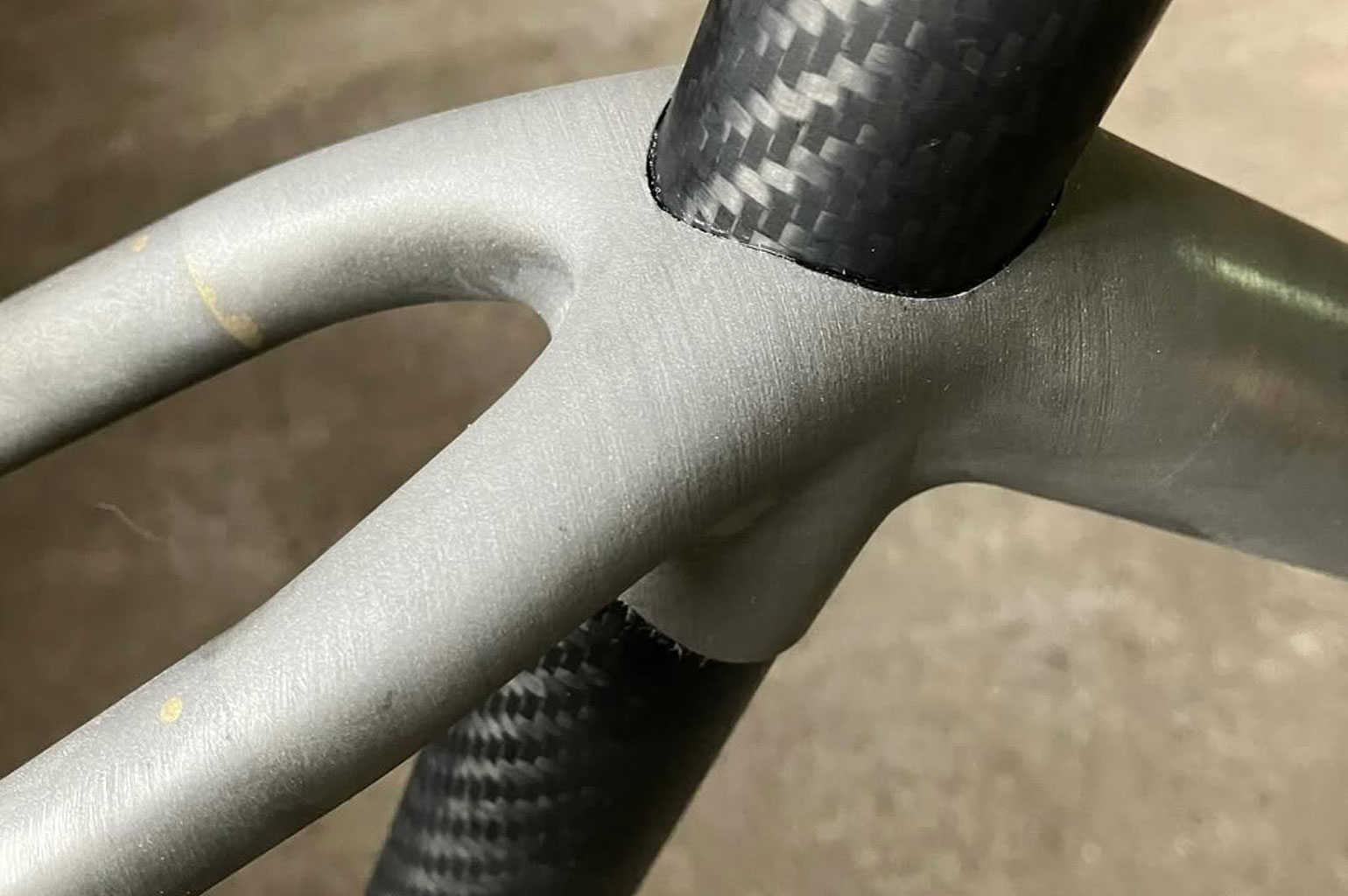 3D geprinte lugs zie je erin terug en de overgangen van carbon naar staal zijn super strak gedaan. De bovenkant van de zadelpen is van titanium, ook 3D geprint. Naast carbon is er verder gebruik gemaakt van Reynolds 853 staal en de onderbuis is Columbus Spirit HSS staal. De carbon zadelbuis is niet te missen en als je dan denkt dat je kijkt naar de decals met logo’s erop, dan heb je het mis. Het is allemaal gespoten, zonder decals dus. Heel erg mooi handwerk dit!