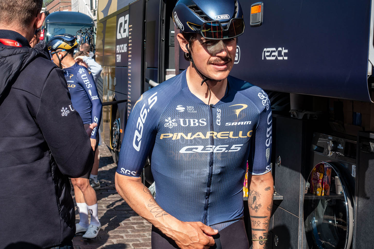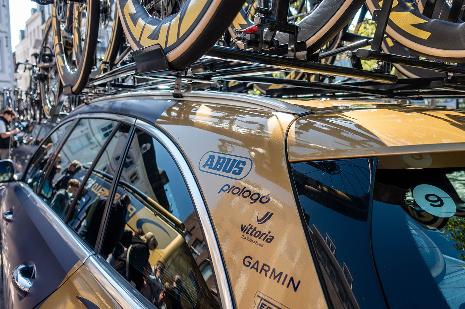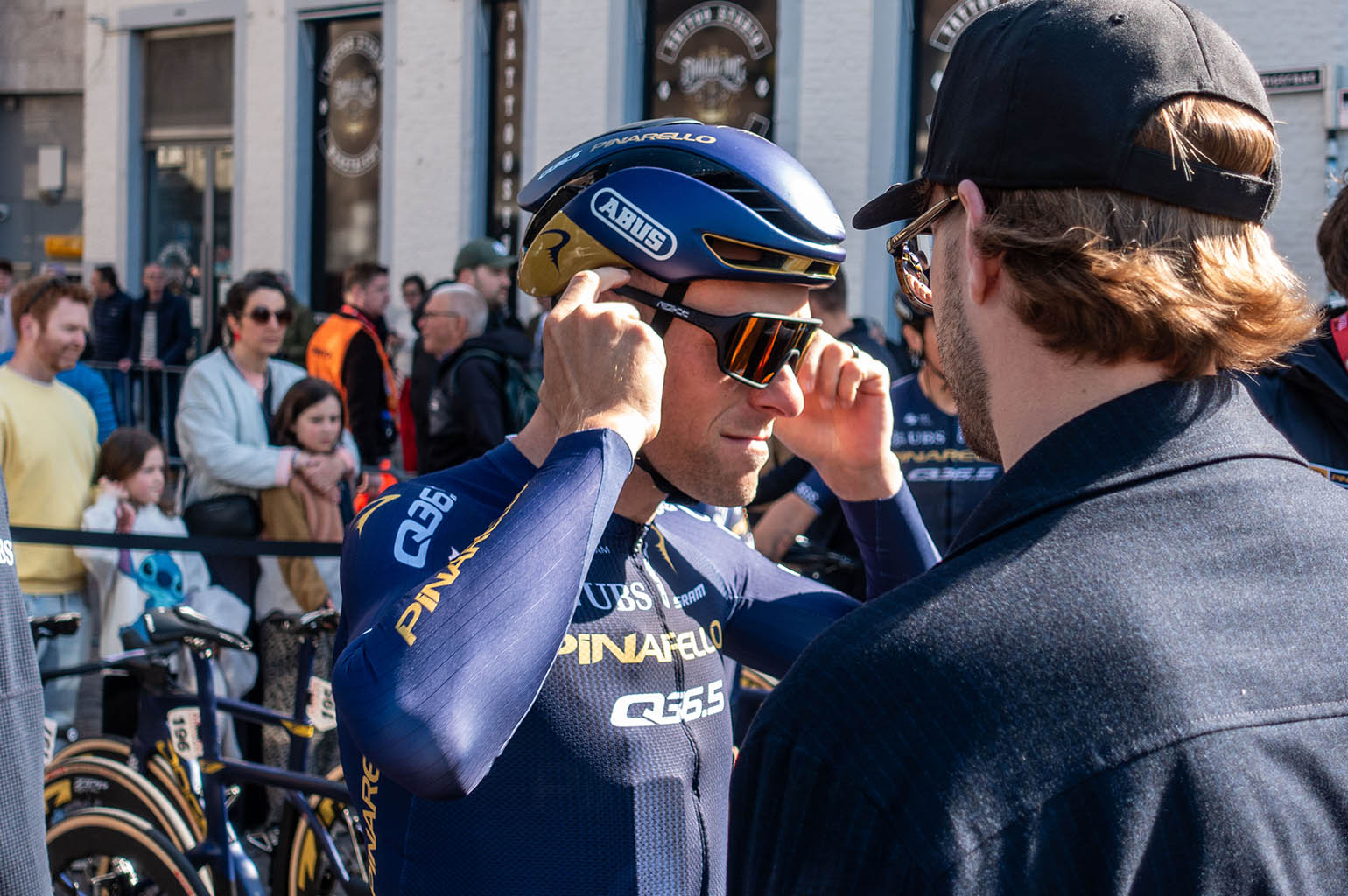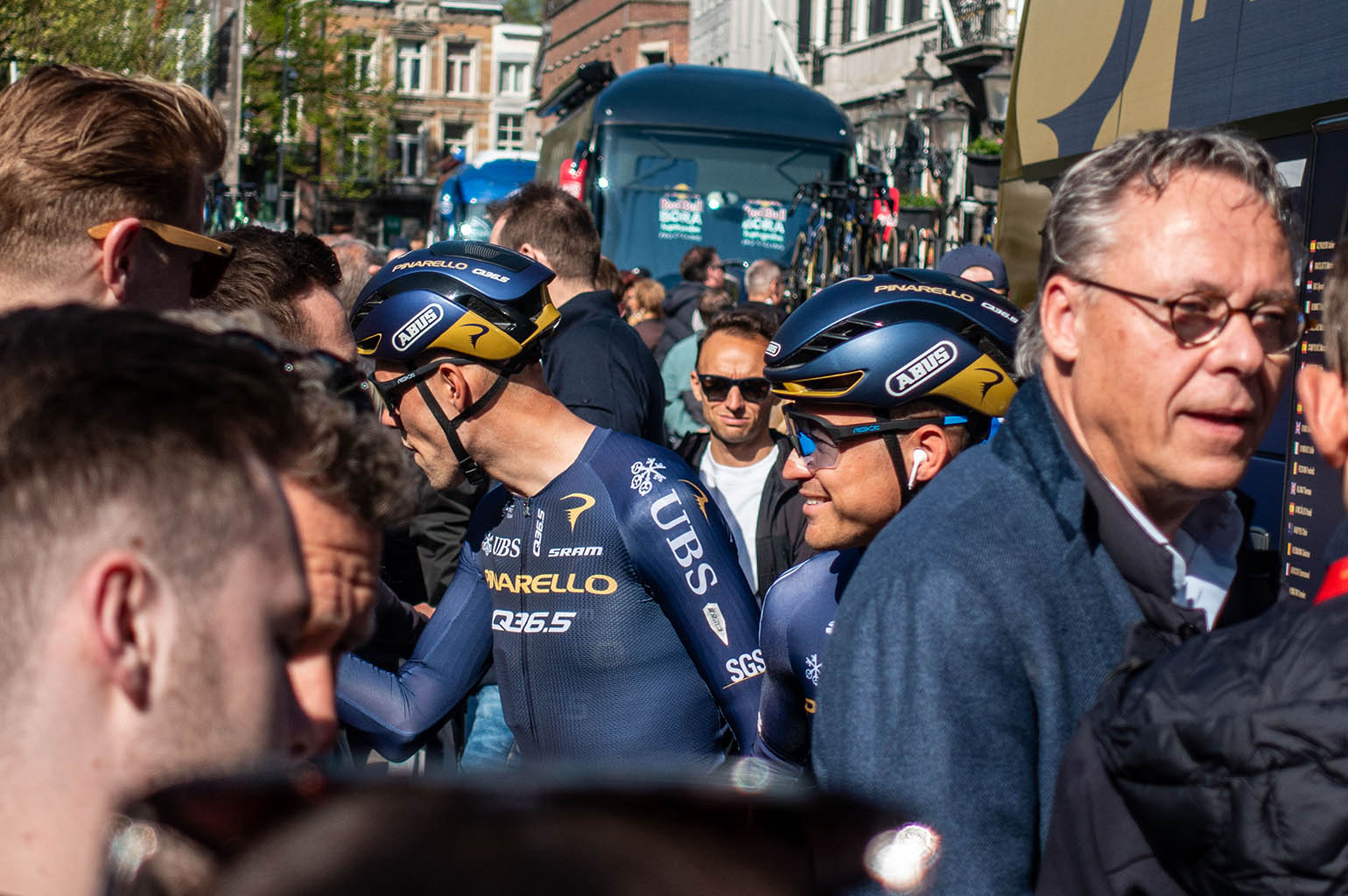 Een dagje de Amstel Gold Race kijken, daar zeggen we geen nee tegen. We waren te gast bij het Pinarello Q36.5 Pro Cycling Team op uitnodiging van ABUS. Want er was een helmen-nieuwtje maar daarover zo meer. Het team had op papier toch wel een kanshebber voor de overwinning, deze AGR. Op papier, want door de val van Pidcock in de Ronde van Catalonië, zorgde z’n herstel voor een kink in de planning. Helaas was hij er niet bij. Maar dat mocht de sfeer bij het team niet drukken.