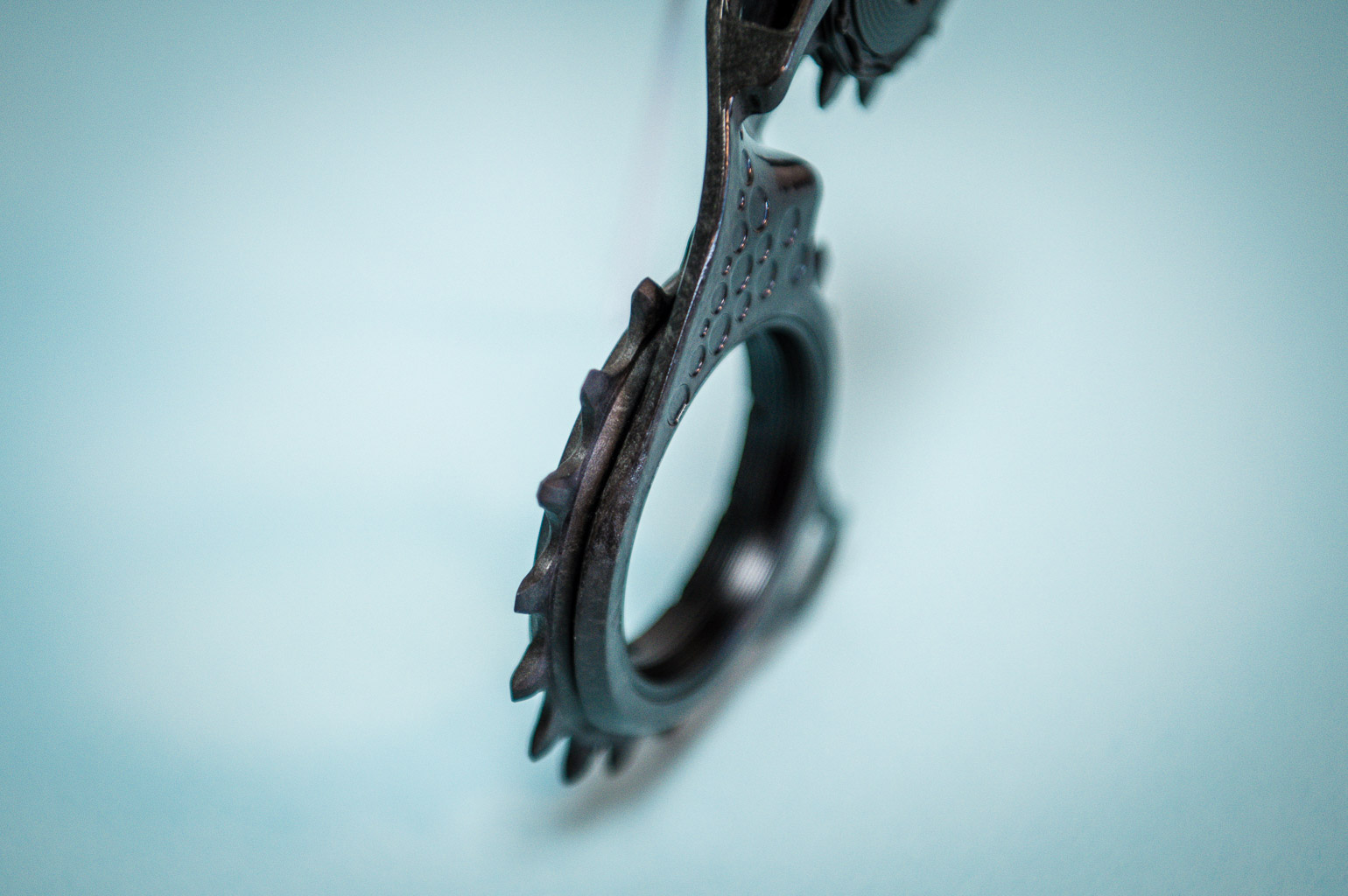 De overtreffende trap van een oversized derailleur-kooi! De HOLLOWcage bestaat uit een ‘mono-plate’ carbon kooi en deze uitvoering past op de Shimano Dura Ace Di2 12-speed derailleur. Een enkele kooi, met twee derailleurwieltjes voorzien van keramische lagers. Het meest opvallende is wel de grote ‘holle’ opening in het onderste derailleurwiel, die er in verschillende kleuren is, waardoor het er erg futuristisch uitziet. Hier de zwarte uitvoering.
