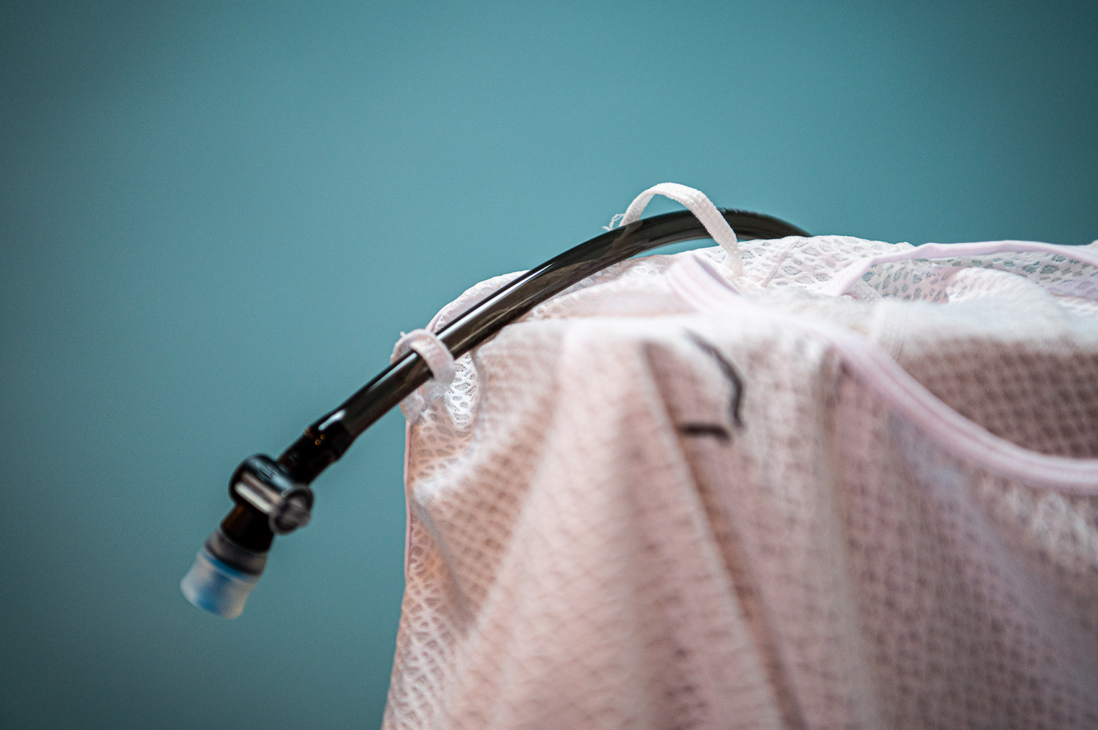 Fraai, maar bijna niet zichtbaar. Deze Airoman Aero EVO baselayer met compartiment voor een waterzak zit namelijk onder je snelpak of aero-jersey. Geen rugzak nodig, maar toch twee liter extra water mee op je rug. Ideaal voor de lange gravelkoersen.