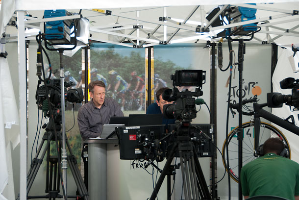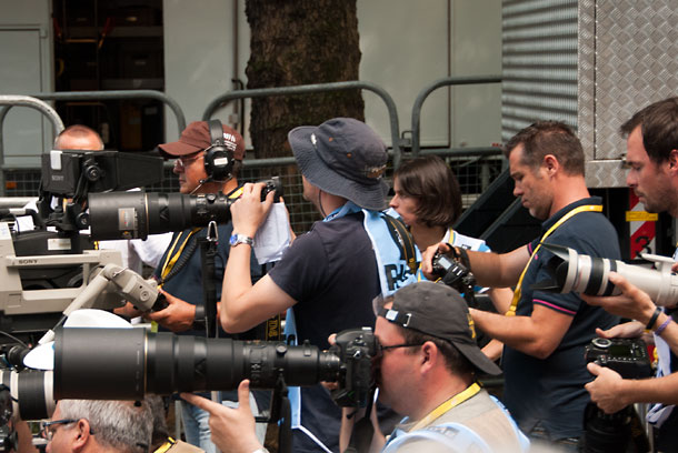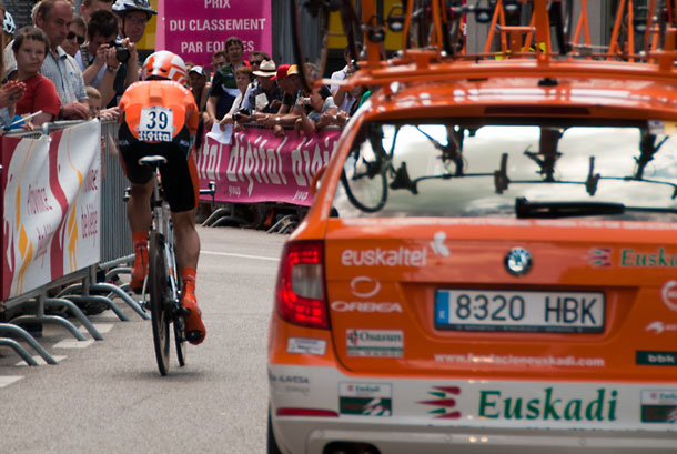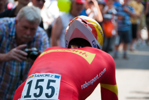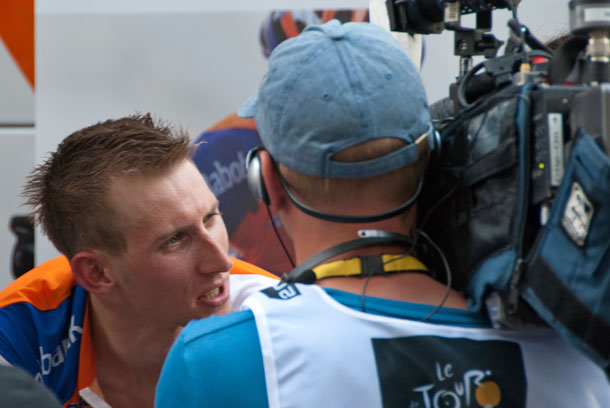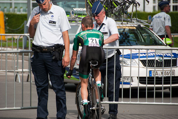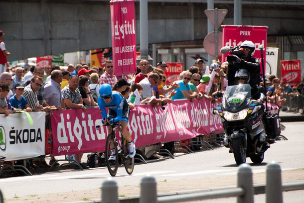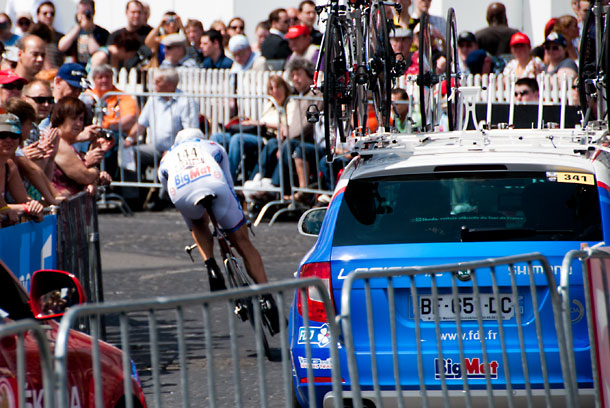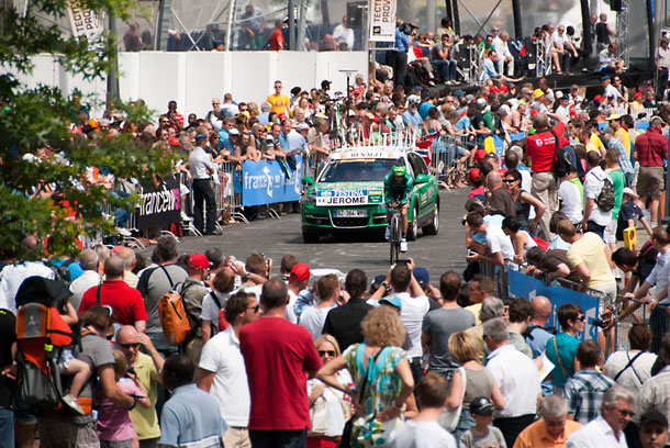 Deze keer was het de eer aan Luik om de proloog te mogen organiseren. Lekker weer en slechte organisatie wat betreft parkeren (maar dat is uiteindelijk goed gekomen). Wie waren er allemaal? Nou eigenlijk iedereen die maar iets met wielrennen te maken heeft. Het was dus lekker druk. Mocht je trouwens nog nooit bij een start van de Tour te zijn geweest, het is een aanrader. Je ziet er van alles, van Mart Smeets die de hele dag aan een tafeltje staat te wachten tot alle renners voorbij zijn tot Cavandish die zijn vrouw en baby een liefdevolle kus geeft, tot aan grappige mensen en allerlei renners.
