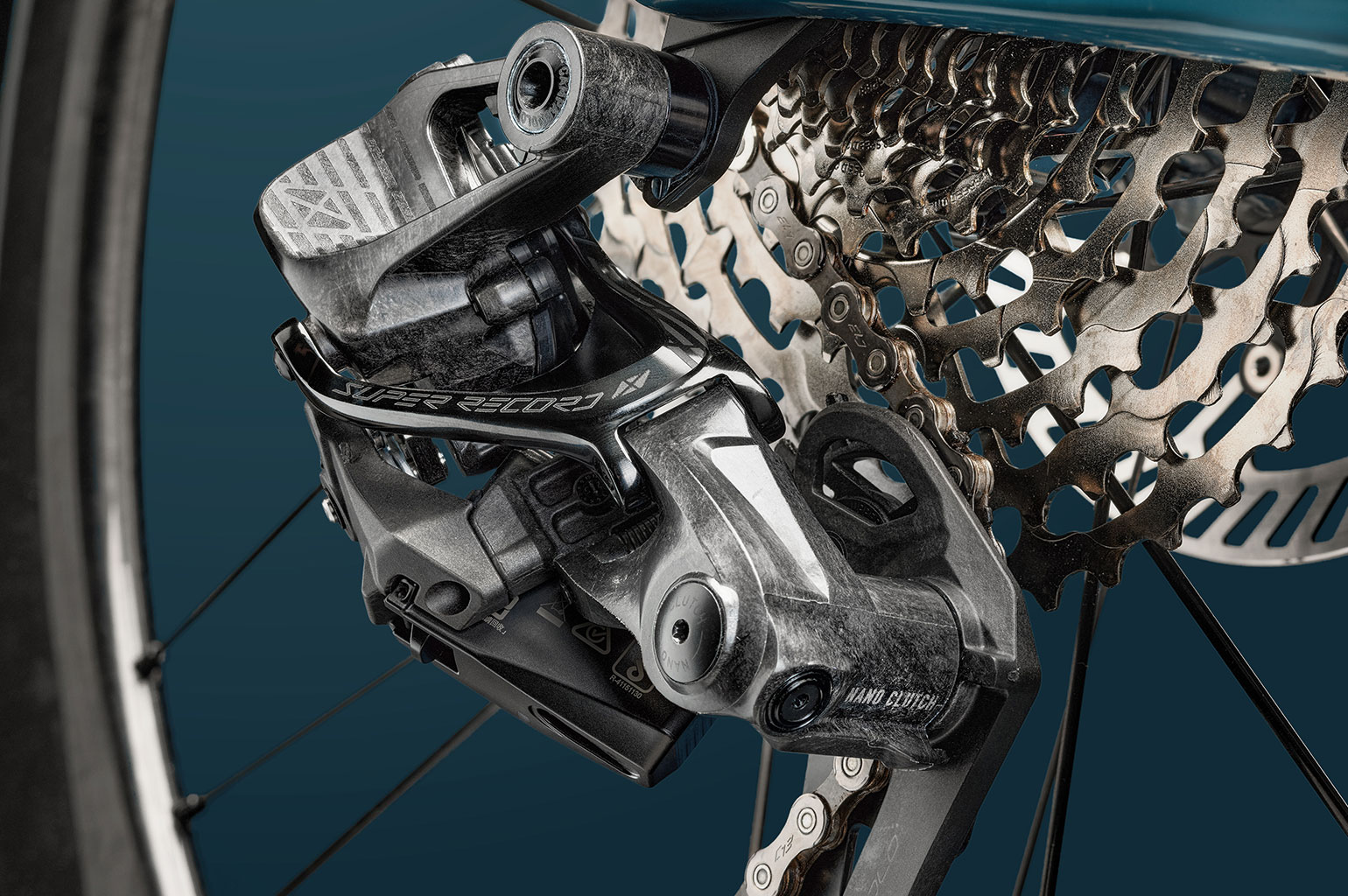 Dan is er ook nog een Super Record Allroad die feitelijk een wegderailleur is met een clutch zodat de kooi altijd op spanning is. Hiermee kan je voor de weg een 1×13 of een 2×13 uitvoering maken waarmee je ook gravelpaden mee kan pakken. Voor deze derailleur zijn er vier cassettes: 10-29, 10-33, 11-32 en 11-36. Zo kan je een 1x rijden en toch de wegcassettes gebruiken.