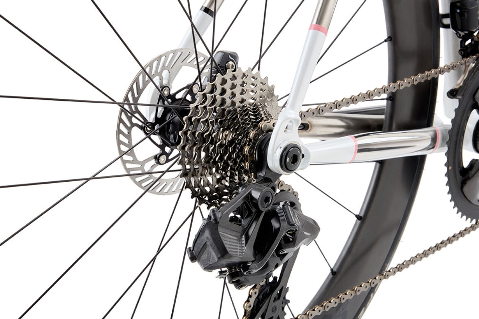 Staal is niet superlicht en daarom weegt een frame 1990 gram en de voorvork die wel van carbon is, weegt 392 gram. Er is ruimte voor 32 mm banden en je kan alleen kiezen uit de elektronische groepsets als afmontage. Ook mooi is de geïntegreerde zadelpenklem. En dat de afwerking strak is, komt deels door de 3D geprinte lugs die de buizen bij elkaar houden. Het frame is ook UDH ready. Voor het bottombracket is gekozen voor een T47.