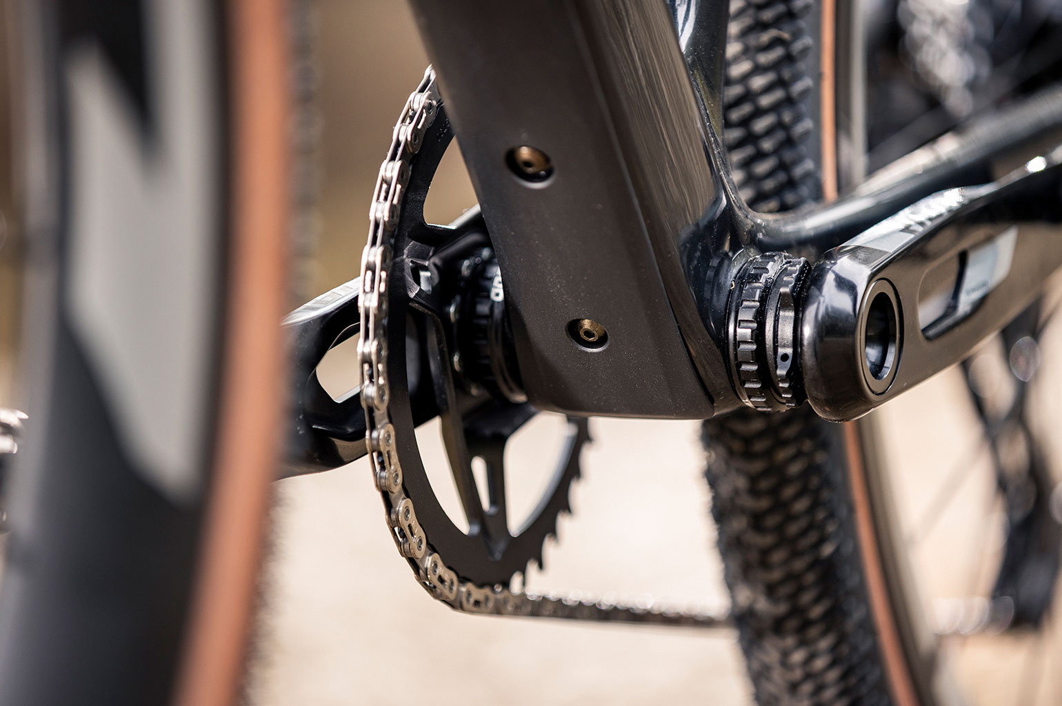 Deze aluminium 6 serie heeft op verschillende plekken nokjes om tassen of rekken te monteren. De voorvork is trouwens wel van carbon. De maximale bandbreedte is hier net iets meer dan bij de carbon 8 serie. Je kan hier maximaal 48 mm banden in kwijt.
