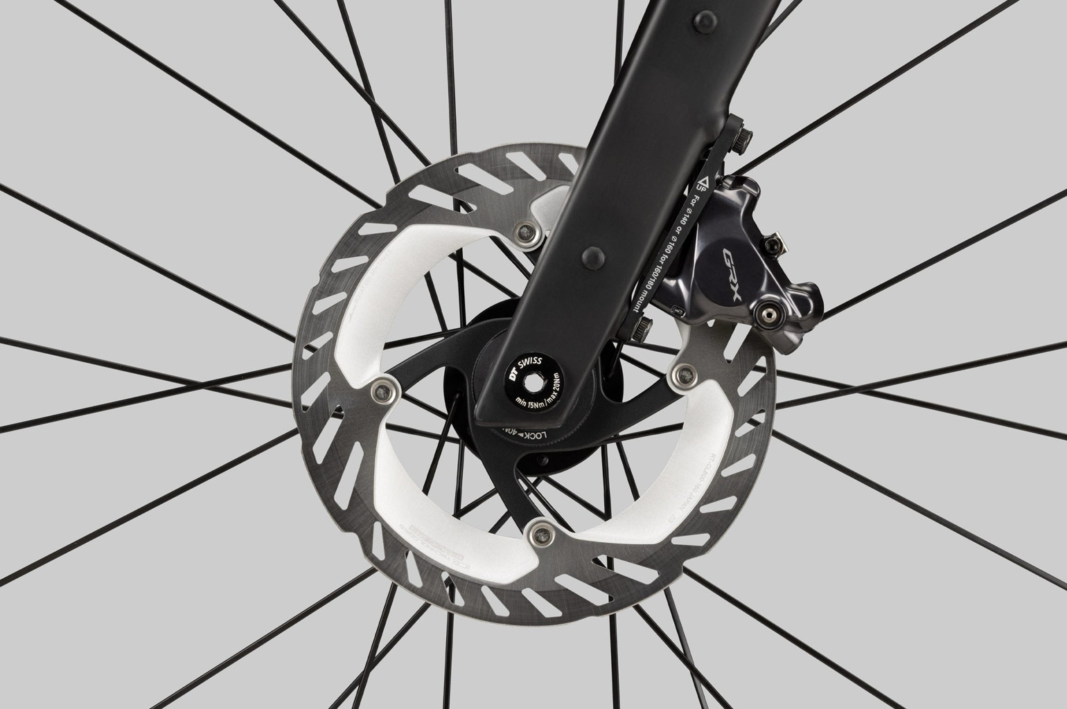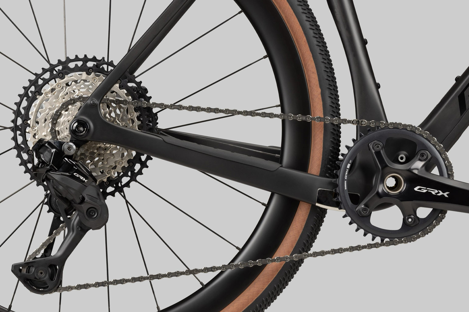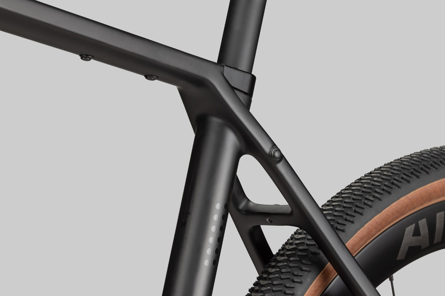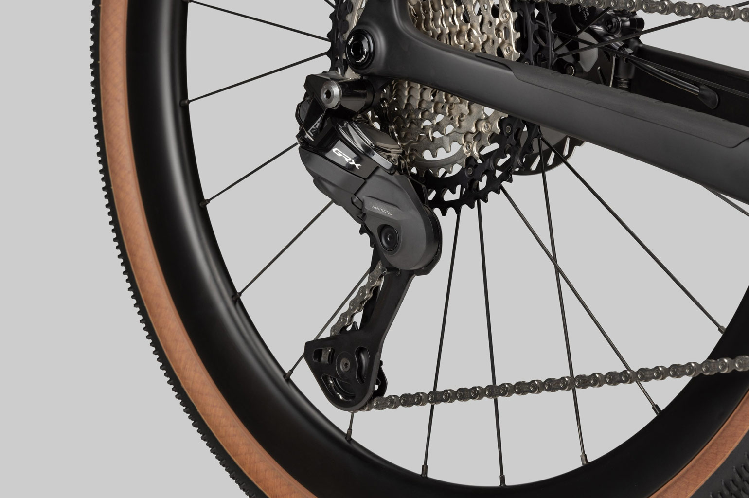 De Regard 9.0 is uitgerust met de Shimano GRXDi2 1×12 groep waarmee je dus elektrisch schakelt. De wielen zijn de Mavic Allroad S en die wegen 1695 g, zijn 42 mm hoog en hebben 25mm interne breedte. De banden zijn de snelle Schwalbe G-One R pro van 45 mm breed, maar de wielen zijn ook compatible met 30 mm wegbanden tot 2,5 inch mtb-banden. Met de 160 mm schijfremmen van Shimano GRX en het Selle Italia SLR Boost zadel kunnen we stellen dat er qua onderdelen een goed pakket is samengesteld dat in de optelsom echt leidt tot een volwassen fiets. De bevestigingspunten voor fietstassen en accessoires maken de Regard ook geschikt voor langere of zelfs meerdaagse bikepackingtochten.