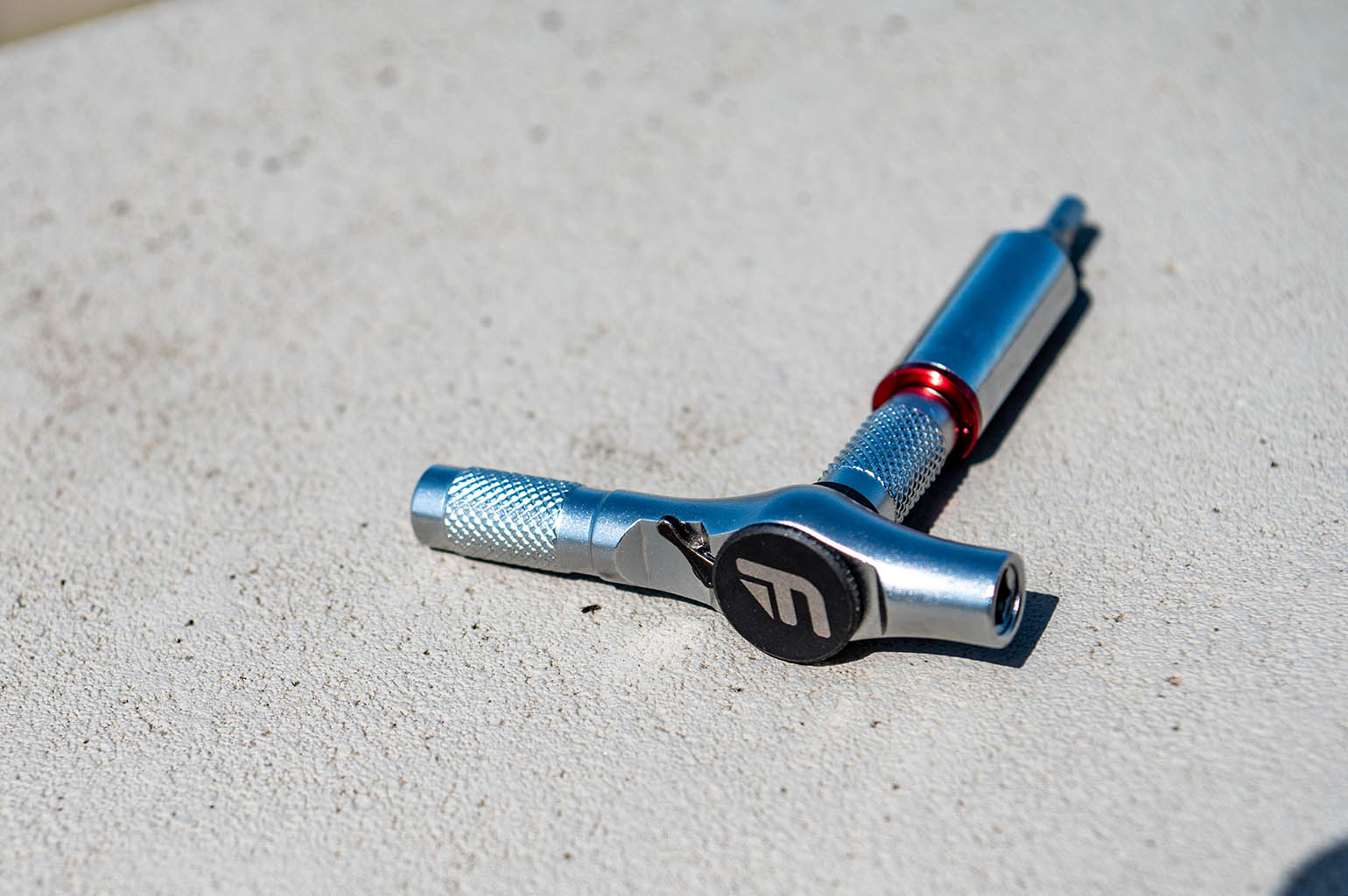 Omdat de opening voor de bitjes kleiner is (4mm) dan bij de andere tools zijn deze bitjes slanker dan de gewone bitjes. De uiteindes zijn de gewone maten die je verwacht. Je hebt hier in totaal 6 bitjes maar omdat je sommige bitjes aan twee kanten kan gebruiken zijn er effectief 10. Hier wel naast een platte schroevendraaier ook een kruiskop. De bitjes zijn bewust zo klein gemaakt dat je ze makkelijk in de dop van de tool kan opbergen. Deze tool is dan ook erg licht, helemaal voor wat hij kan. In het geheel zit een scharnierpunt waardoor de buitenkant vanzelf een hefboom geeft. De tool is van CNC aluminium. Volgens Feedback Sports heeft deze tool als enige van de vier geen einde van z’n levenscyclus. Dat heeft te maken met de constructie. Voorwaarde is wel dat je nooit meer dan 8Nm een boutje mag aandraaien.