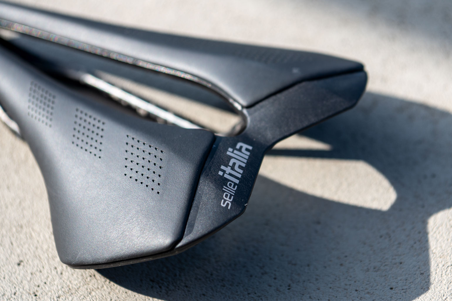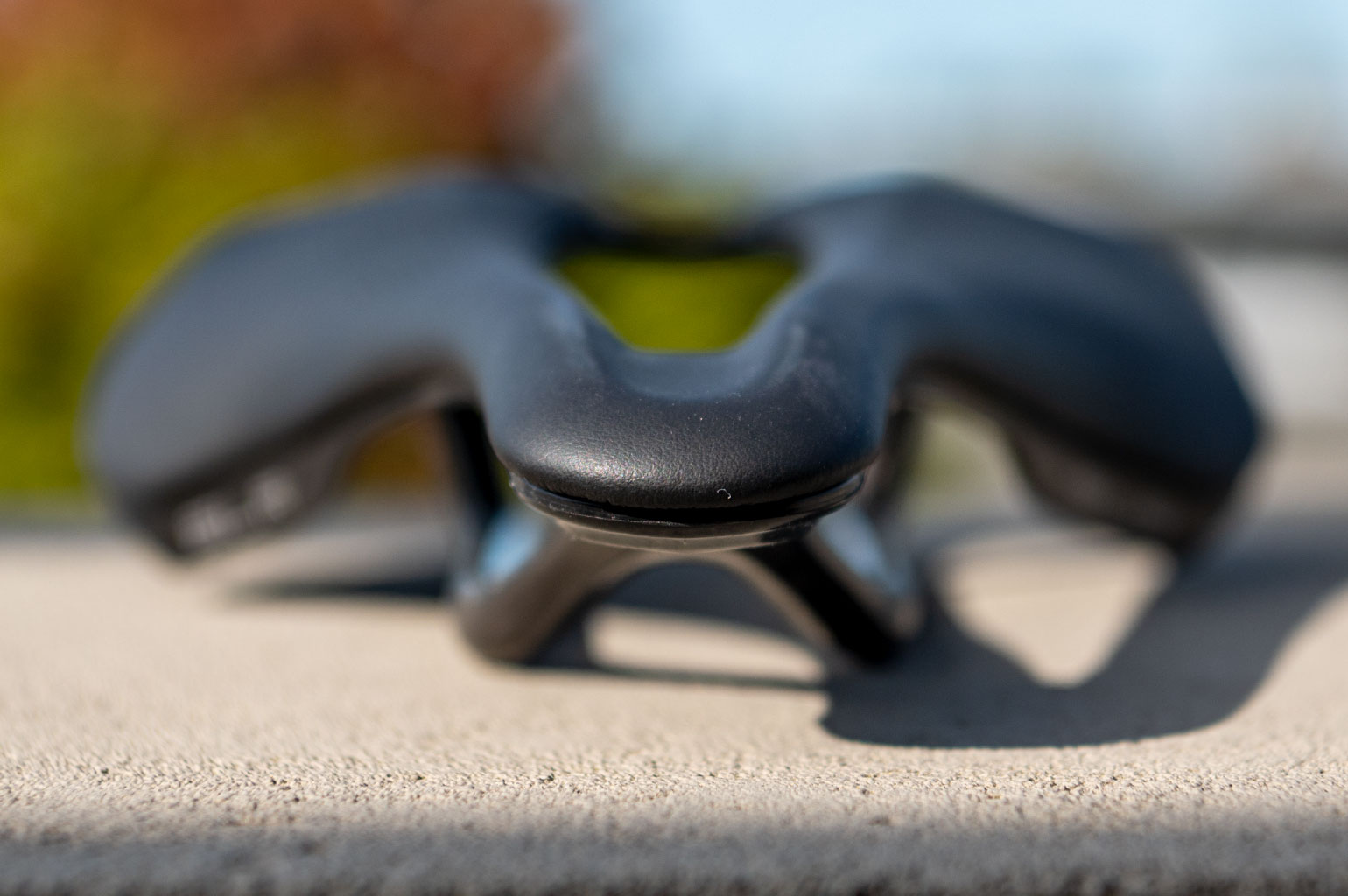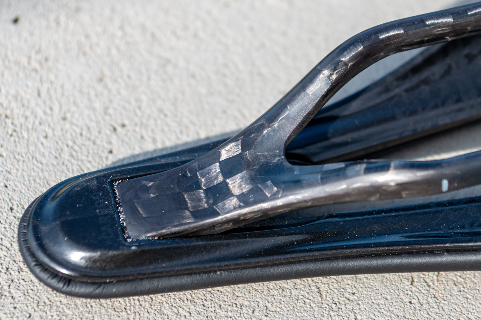 Als je het zadel een beetje ronddraait, zie je de carbon met nylon polymeer schaal maar ook de carbon rails. Het zadeldek waarvan de bovenlaag met de hand wordt gemaakt, voelt stevig en dun en er is een flinke opening in het midden.