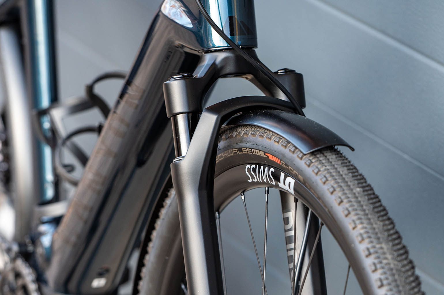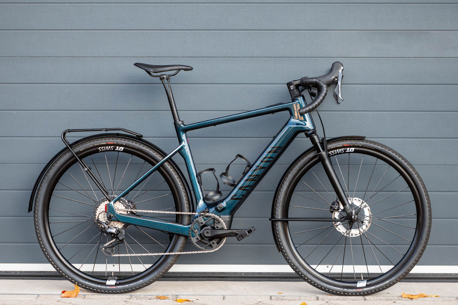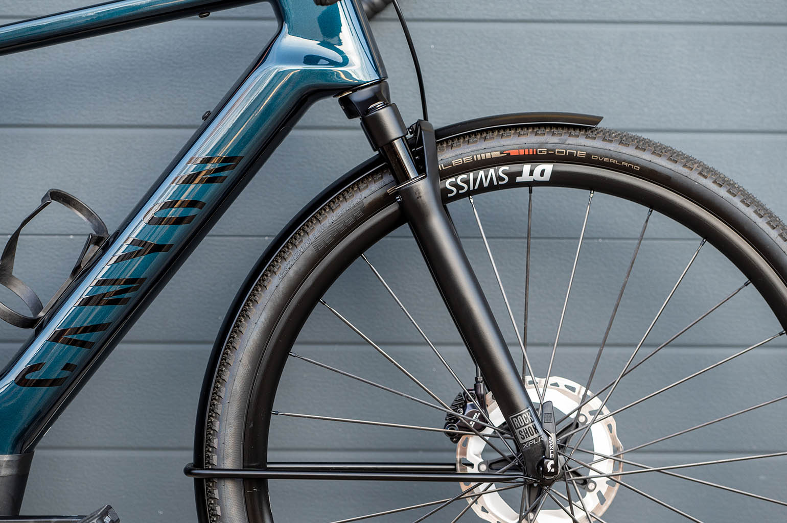 Ik zal uitleggen waarom ik precies deze Canyon heb uitgekozen. Het is een erg complete en robuuste E-gravelbike en dat was voor mij de voorwaarde. Dus met vaste spatborden, interne verlichting die werkt op de accu van de fiets. Stevige aluminium wielen en de banden moesten flink zijn, want ik wil goeie grip en liever niet lekrijden, helemaal niet in vervelend weer. De Canyon kwam met de 45 mm Schwalbe Overland, die op papier aan mijn wensen voldoet.