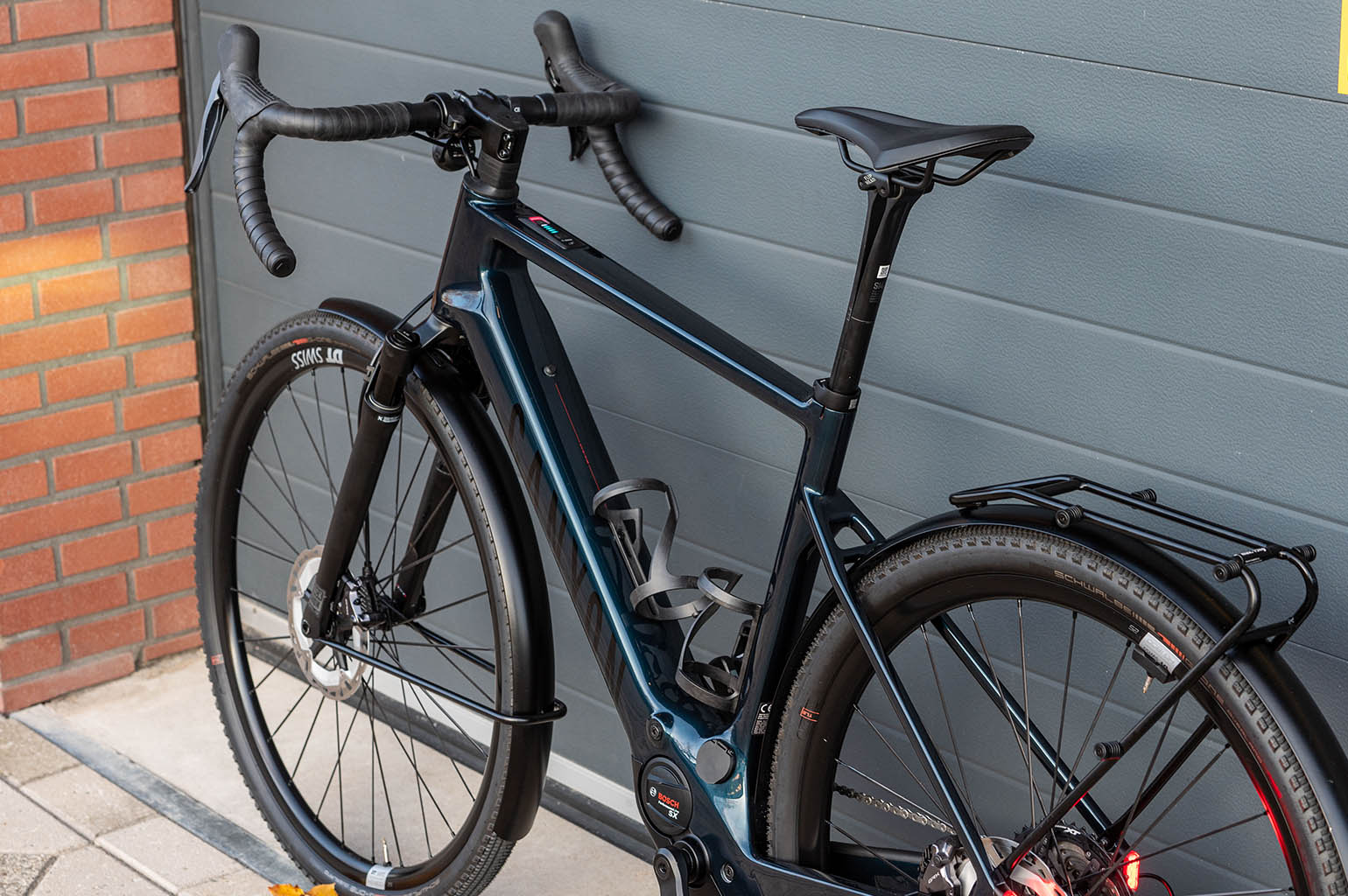 Dan nog even kort over de Schwalbe Overland banden. Ze zijn wat breed vergeleken met je racefiets, maar geven goed grip in de nattige weersomstandigheden. En daarbij zijn ze erg lekbestendig, wat echt een voorwaarde voor me was. Ik heb geen zin om elk ritje de band af te speuren op kleine schelpjes die erin kunnen zitten. Ik heb geen enkele keer lek gereden. Toch rolt de band best goed en als je op het asfalt zonder hulp van de motor rijdt, heb nog steeds het gevoel dat je vooruit gaat. Lekbestendigheid van het rubber was een must, snelheid is mooi meegenomen. Ondertussen heeft Schwalbe haar Overland band vernieuwd, maar dat even terzijde. De stevige bagagedrager is handig om fietstassen aan te klikken. Maar persoonlijk heb ik het merendeel een rugzak gebruikt, vind ik handiger.