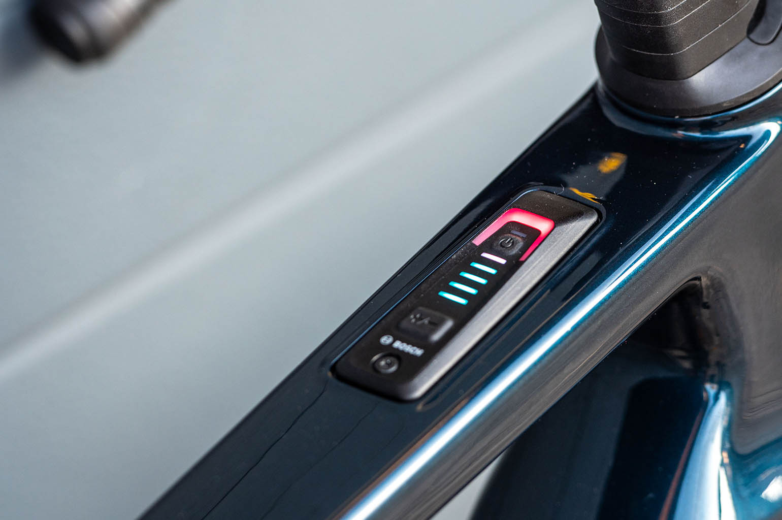 400 Wh van de accu zorgde ervoor dat ik op één accu op vooral asfalt zo’n 60 km kon rijden op de hoogste motorstand. Dat was terwijl het de temperatuur net boven het vriespunt lag. Fiets je met een standje lager, wordt de afstand langer, fiets je meer offroad en met meer hoogtemeters, wordt de afstand logisch iets minder. De bediening op de bovenbuis is duidelijk en makkelijk te bedienen, ook met dikke handschoenen aan. Het werkt met een aan/uit knop en een knop waarmee je door de 5 standen gaat en vijf streepjes geven aan hoe vol je accu nog is.