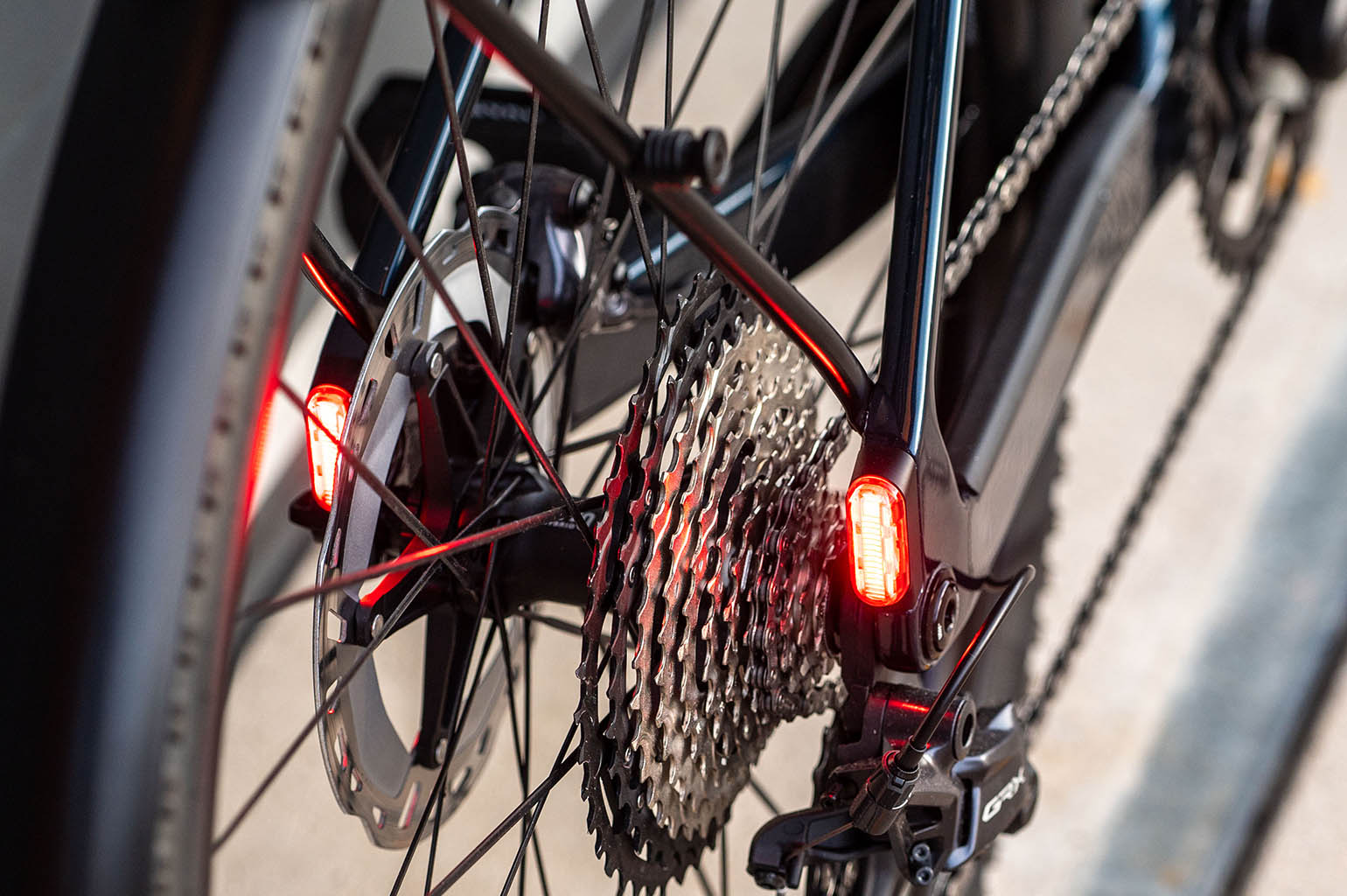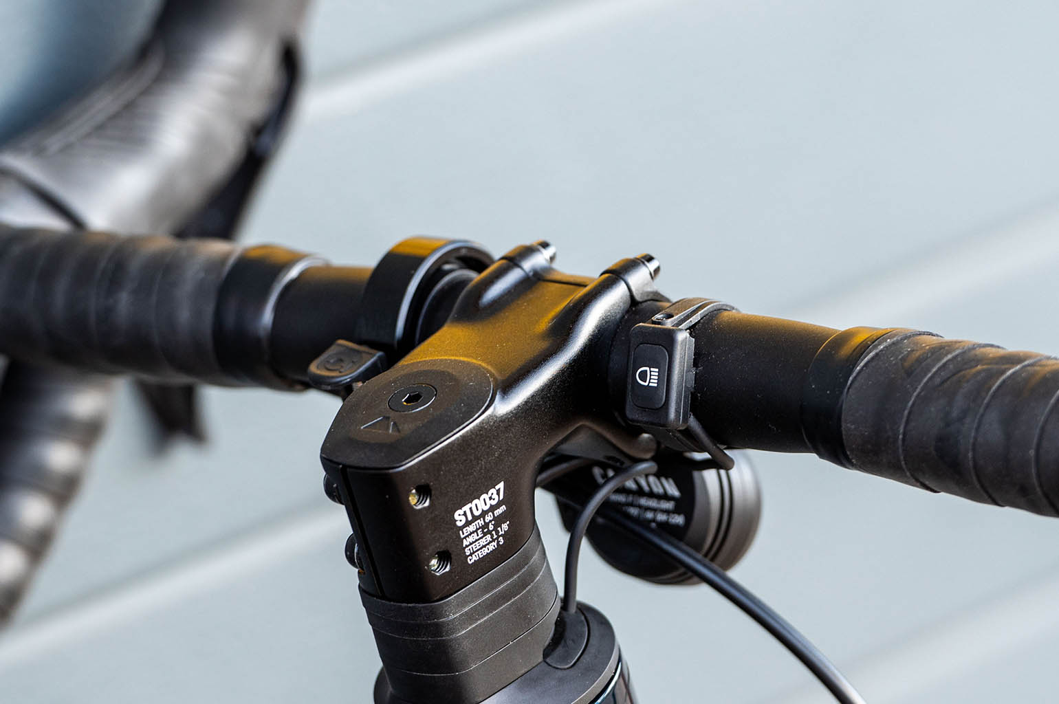 Achter heeft de fiets twee ingebouwde lampjes ter hoogte van de naaf van het achterwiel. Deze zijn altijd aan, want zoals Canyon redeneert: waarom zou je ze uitzetten als het om veiligheid gaat? En daarbij verbruiken de achterlichten erg weinig energie van de accu. Voorop zit een koplamp met twee standen. De normale dimlicht-stand, die overigens al echt veel licht geeft, en de grootlichtstand. Grootlicht voor als je alleen op donkere weggetjes rijdt zonder straatverlichting. Die stand wissel je met een knopje op je stuur. De koplamp kan je wel handmatig uitzetten, mocht je overdag rijden. Dit omdat de koplamp iets meer energie verbruikt dan de achterlichten. Beide lampen zijn gemaakt in samenwerking met lampenmerk Lupine.