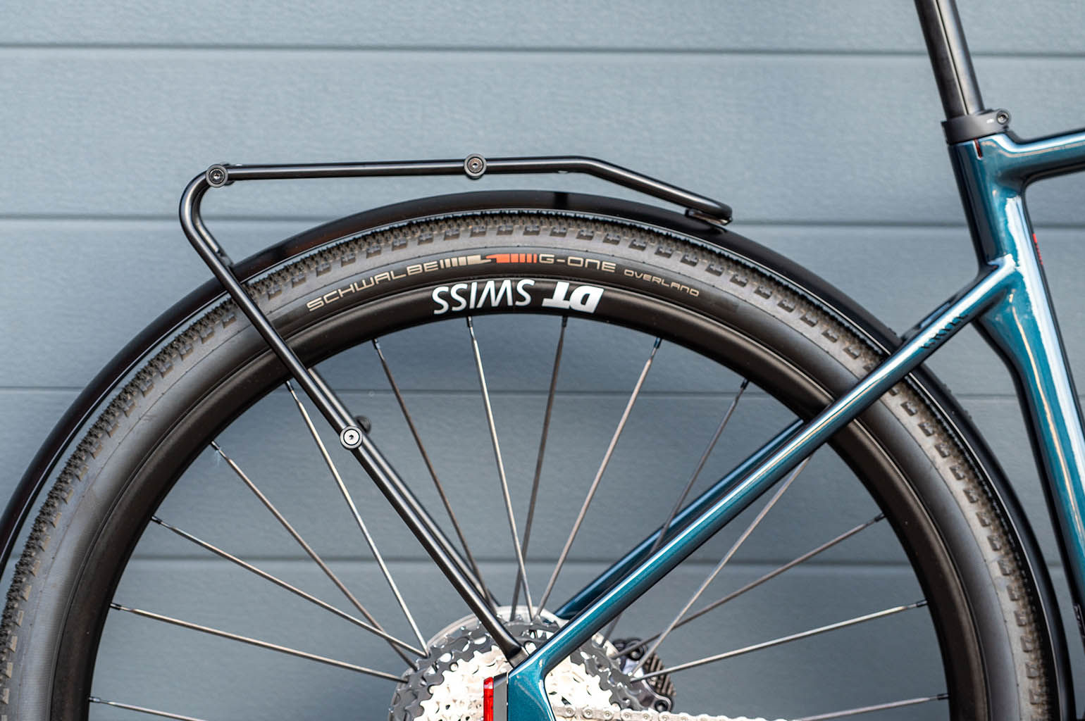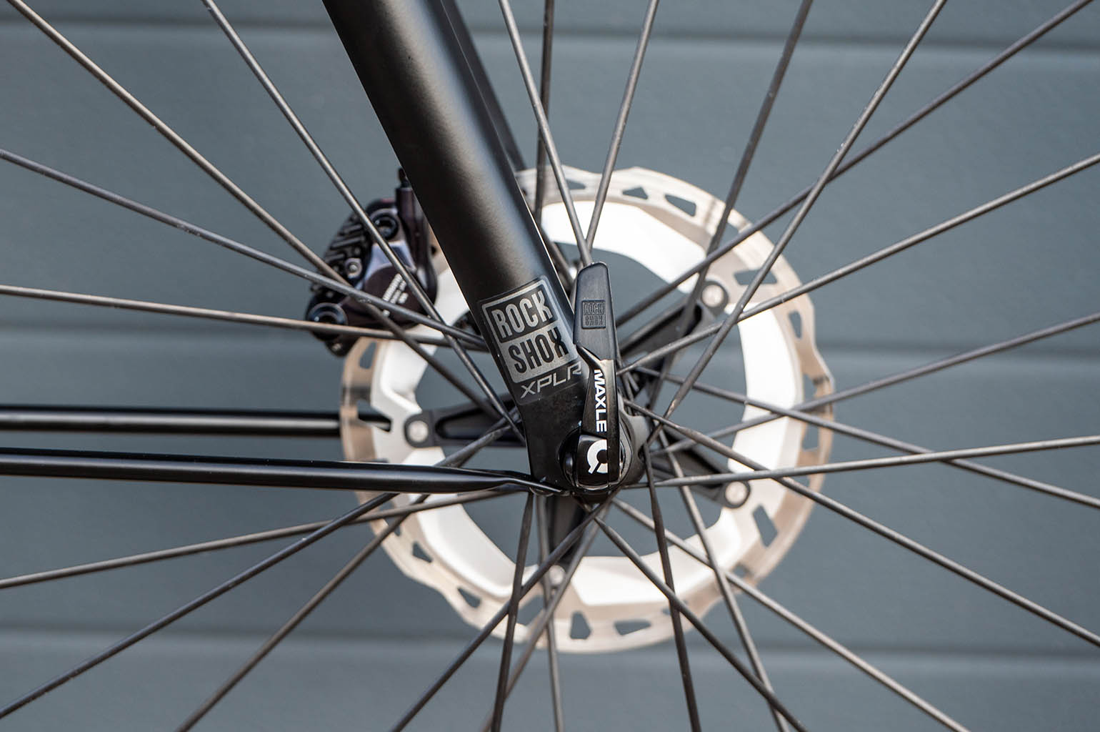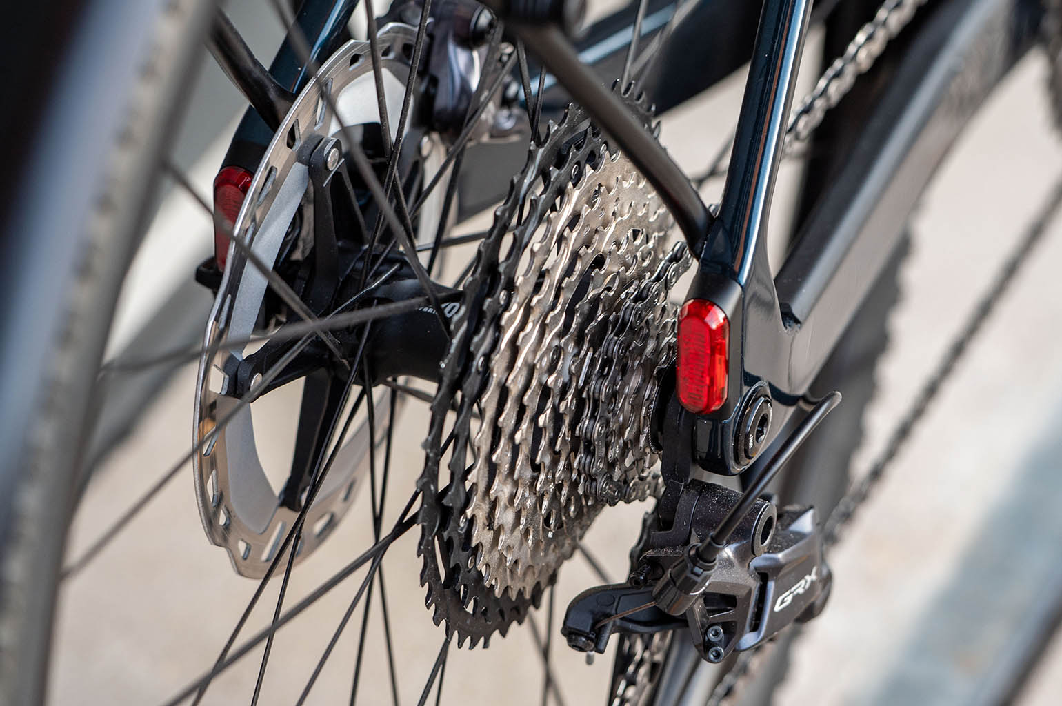 Verder is de groepset niet te ingewikkeld, lekker mechanisch in de vorm van de Shimano GRX 800 serie. Een enkel voorblad en een 12-speed cassette, dus alleen met de rechter shifter schakelen. De fiets heeft verder nog een stevige bagagedrager en een Rockshox Rudy verende voorvork met 40 mm veerweg. Die laatste had ik niet op mijn wensenlijstje staan, maar die zat er nou eenmaal op. De adviesprijs van deze specifieke Grizl:ONfly is 5.499,-.